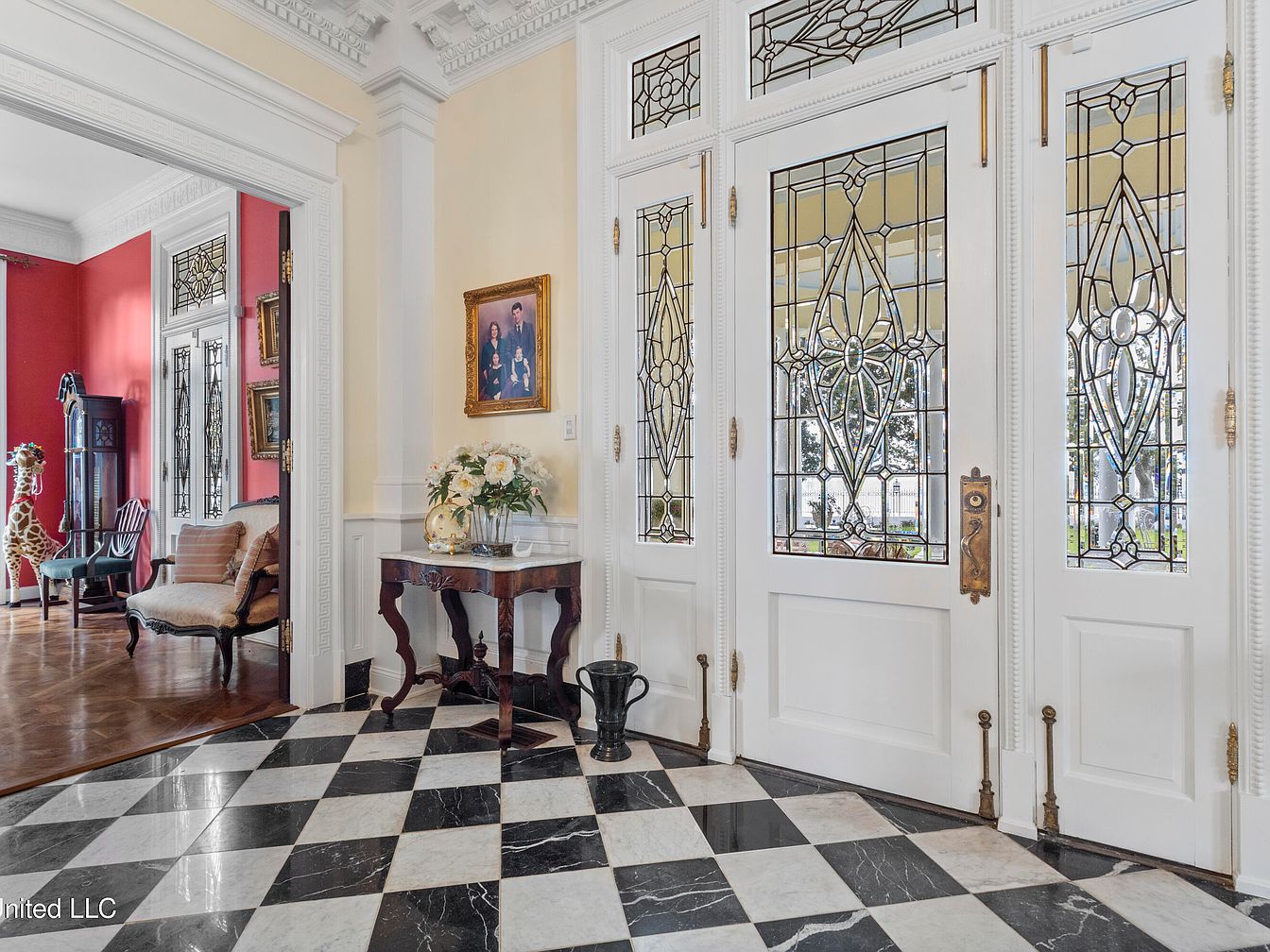This entryway features an elegant black-and-white checkered marble floor that exudes classic sophistication. Flanking the entrance are intricately designed stained glass doors, showcasing floral motifs that enhance the home’s historic charm. The walls are painted a soft yellow, providing a warm backdrop to the space. A wooden console table stands against one wall, adorned with a glass vase of delicate flowers, which adds a touch of freshness. A portrait in a gilded frame hangs nearby, contributing to the inviting atmosphere. The space is well-lit, with natural light filtering through the glass, creating a welcoming entry.