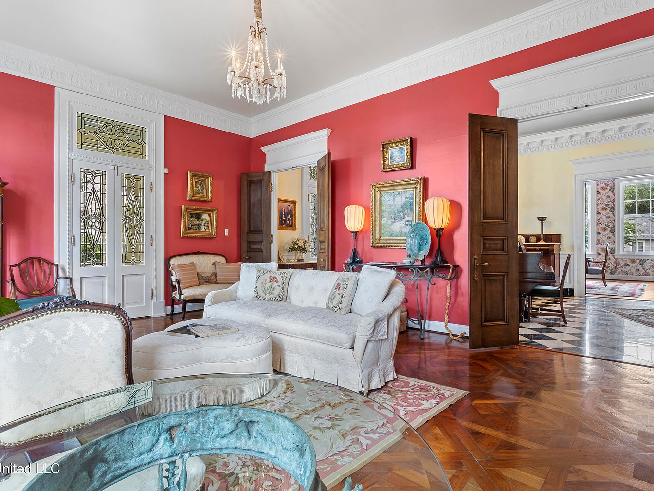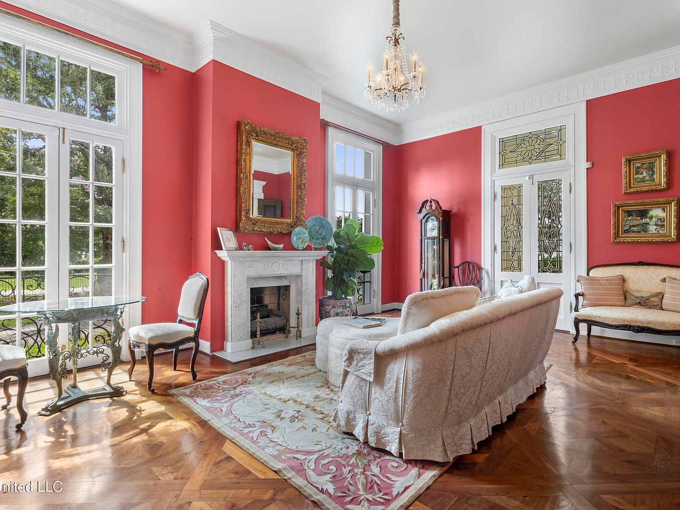 The room features a striking vibrant red wall, enhancing the warm ambiance. Elegant furnishings include a plush white sofa adorned with decorative pillows, and a glass coffee table with intricate patterns. A stunning chandelier hangs from the ceiling, casting light across the space. The flooring is rich, with a geometric wood pattern that contrasts beautifully with the soft tones of the furniture. Stained glass double doors lead to the outdoors, while tasteful artwork decorates the walls, adding character. Nearby, a cherry wood door invites access to another room, creating a seamless flow throughout the historic home.