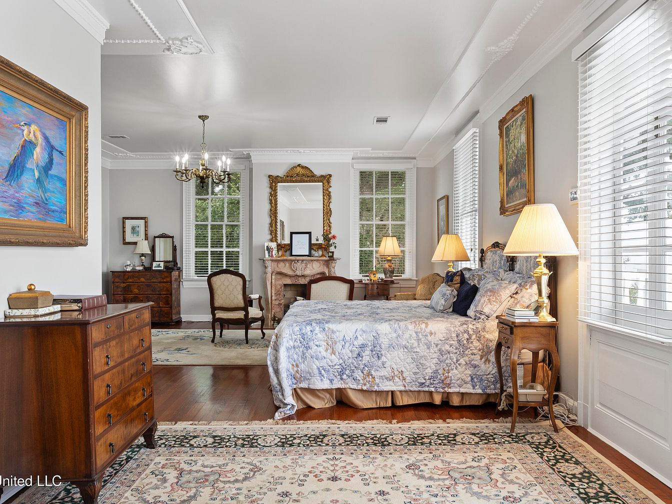 This spacious bedroom features a classic layout with a queen-sized bed adorned in a light blue and floral quilt. Two antique bedside tables with elegant lamps flank the bed, providing soft illumination. A wooden dresser stands opposite, adding warmth with its rich tones. Architectural details include crown molding along the ceiling and expansive windows dressed with white blinds, allowing natural light to pour in. An ornate mirror above a traditional fireplace reflects the elegant decor, while framed artwork adds character to the walls. A patterned area rug anchors the hardwood floor, enriching the room’s vintage charm.