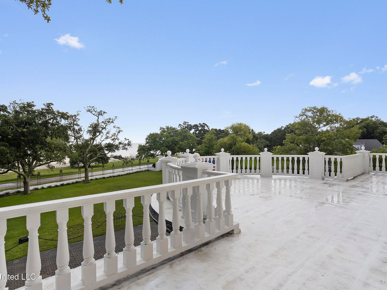 The space features a spacious balcony adorned with classic white railings, providing an elegant architectural element. The flooring is pristine, reflecting sunlight and enhancing the airy feel of the area. Surrounding the balcony are lush green trees, framing a picturesque view of the expansive lawn below. The open sky, painted in soft blue with few clouds, creates a serene atmosphere. The balustrades are prominently designed with a traditional flair, contributing to the overall historical elegance of the house. This outdoor area serves as a perfect retreat, inviting relaxation and gatherings while enjoying nature.