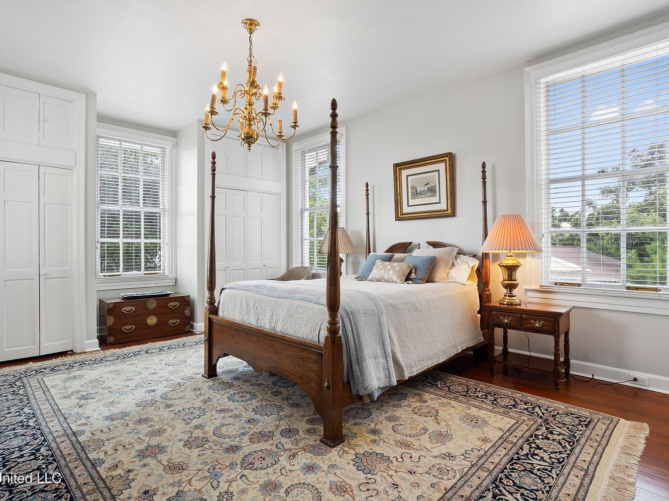 The bedroom features a classic four-poster bed with intricate wooden detailing, dressed in light linens and accent pillows. A rich, intricately patterned area rug covers the hardwood floor, adding warmth and comfort. Light streams in through large windows with white blinds, flooding the space with natural illumination. A vintage wooden nightstand holds a lovely lamp with a soft, warm glow, complementing the elegant golden chandelier above. The room’s color scheme blends soft whites and warm browns, enhanced by tasteful artwork framed on the walls. Built-in cabinetry provides functional storage while maintaining an airy feel.