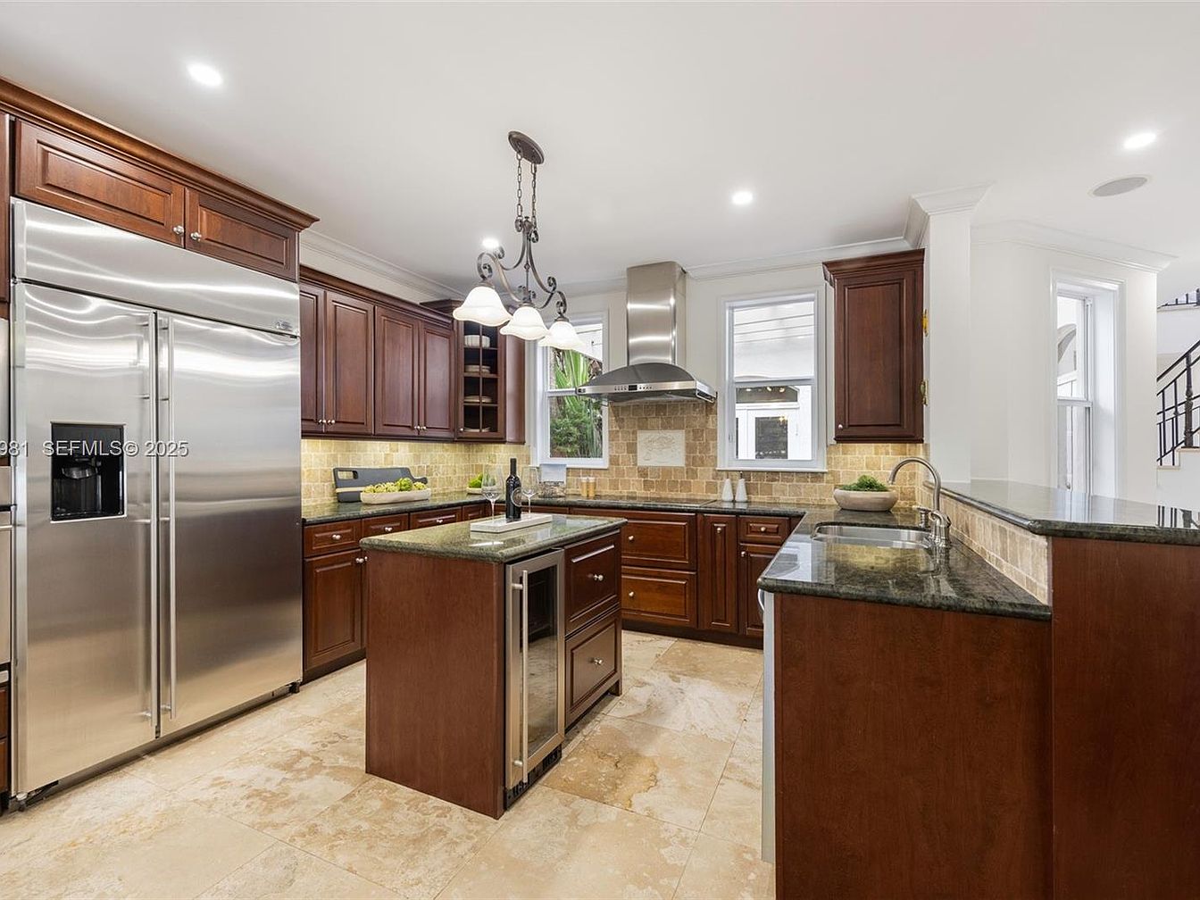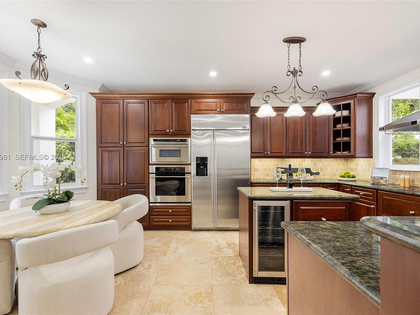This kitchen features rich mahogany cabinetry, providing a warm contrast to the light-colored tile flooring. Stainless steel appliances, including a large refrigerator and sleek range hood, add a modern touch. An expansive central island with a dark granite countertop offers additional prep space and doubles as a casual dining area. The backsplash consists of cream-colored tiles, blending seamlessly with the cabinetry and countertop. Natural light streams in through large windows, illuminating the space and highlighting the inviting ambiance. Subtle pendant lights hang above the island, accentuating its functionality and style.
