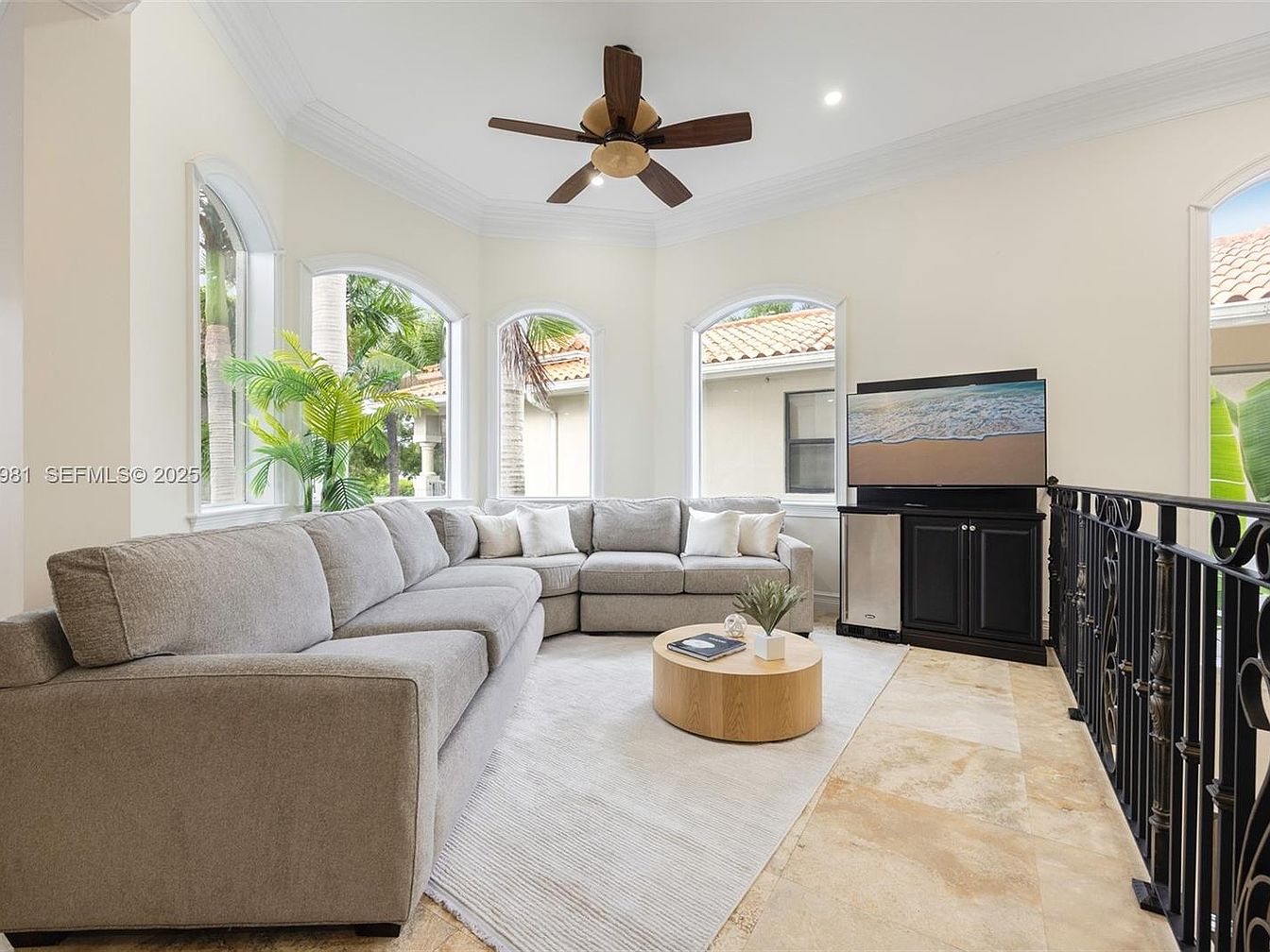 A spacious living room featuring a large gray sectional sofa positioned to optimize views from multiple arched windows. Natural light floods the space, accentuating the soft beige walls and cream-colored tile flooring. A simple round coffee table made of light wood complements the sofa and is adorned with a minimalist decor piece. A black media console holds a flat-screen television, contrasting elegantly with the overall light palette. Decorative palm plants peek through the windows, adding a touch of greenery and enhancing the airy atmosphere. The recessed ceiling with crown molding lends an elegant architectural detail.