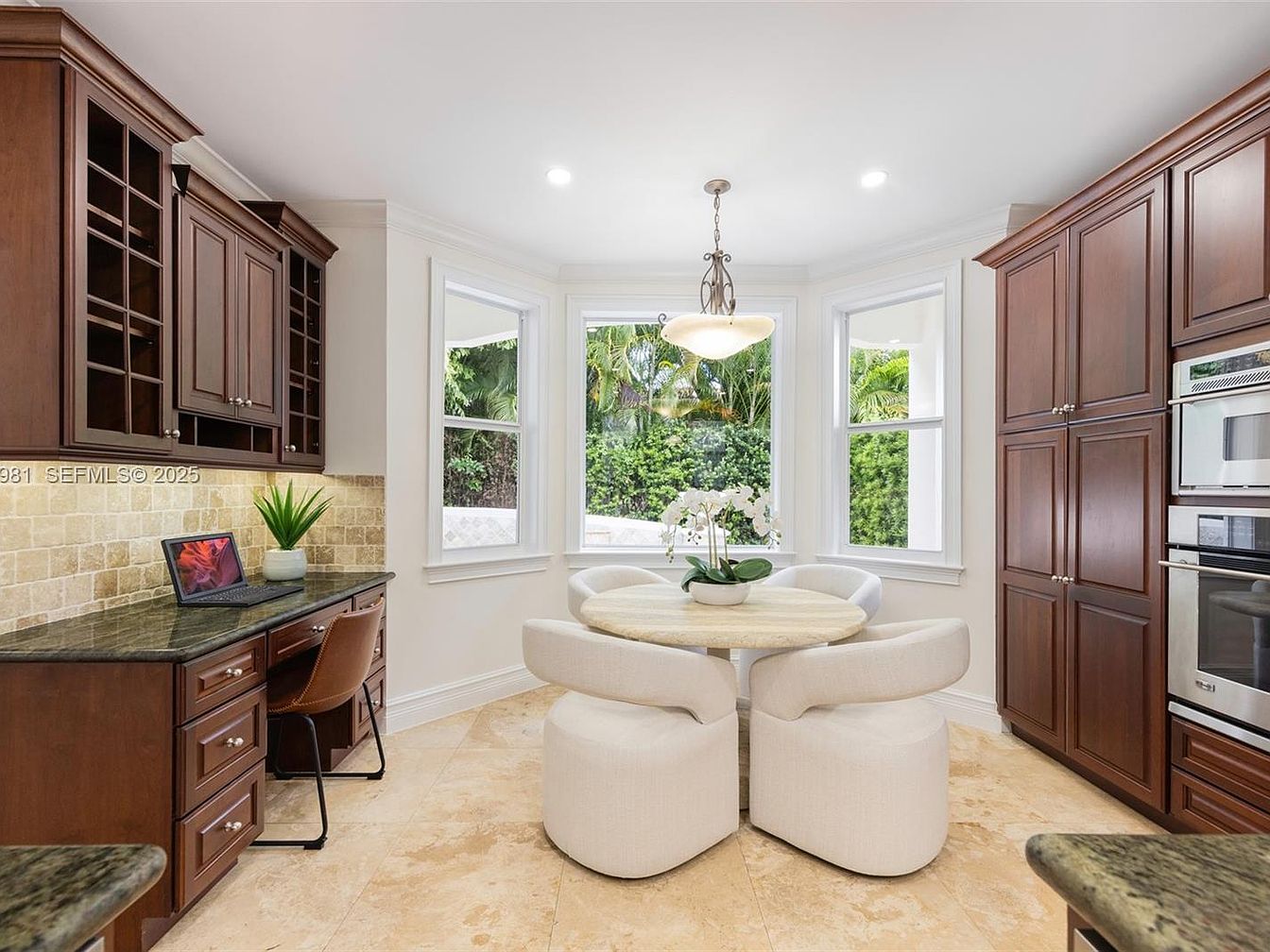 This kitchen showcases a harmonious blend of modernity and traditional design. The rich, dark wooden cabinetry contrasts beautifully with the light-colored, polished marble flooring. An elegant granite countertop adds sophistication, accompanied by a sleek stainless-steel refrigerator and oven. Above, a stylish chandelier with multiple shades illuminates the space, enhancing its inviting atmosphere. A round dining table with plush, light-colored chairs creates a cozy dining nook by the window, allowing natural light to fill the room. Architectural details include decorative molding and strategically placed shelves, highlighting both functionality and aesthetic appeal.