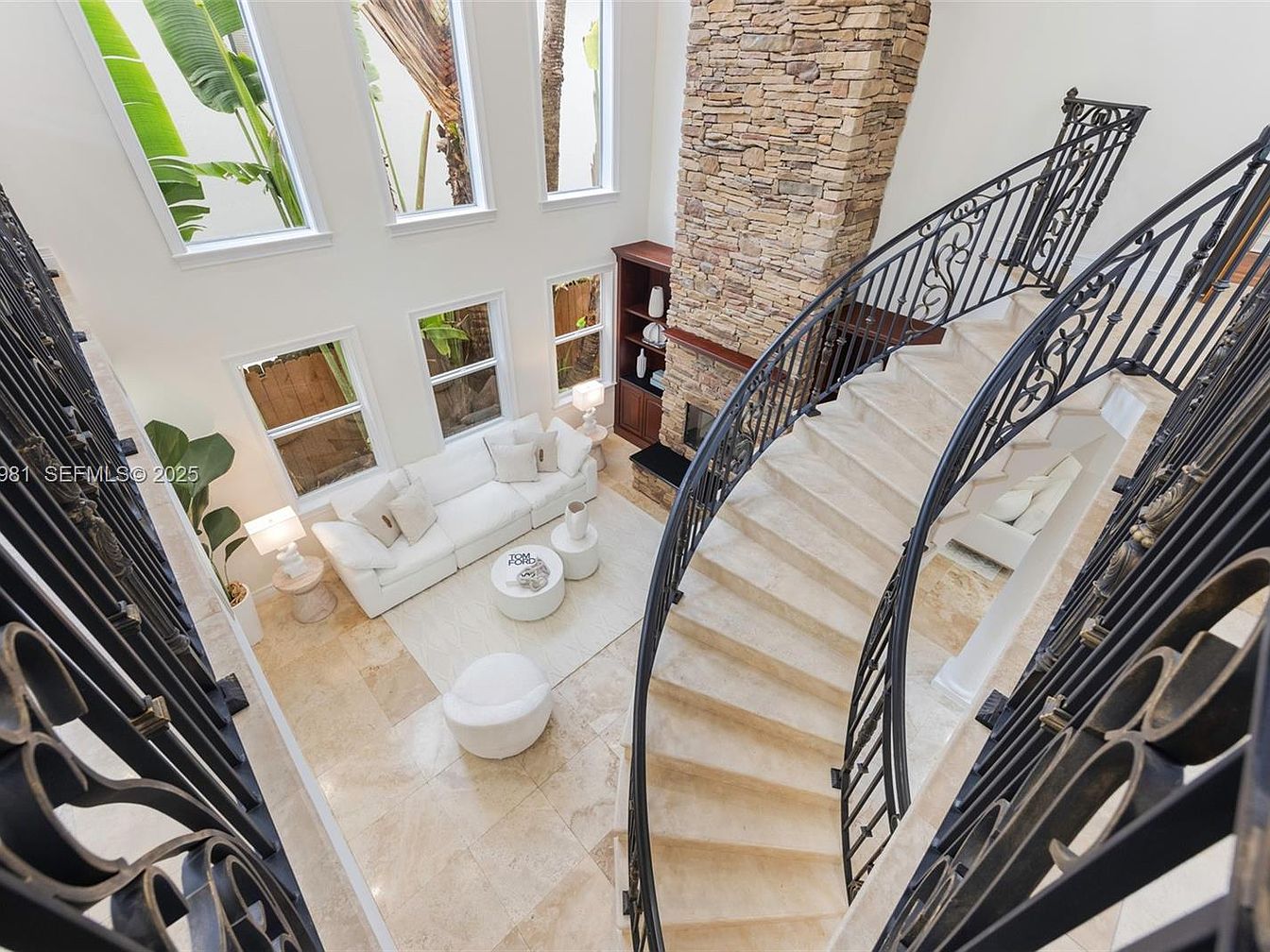 A spacious, elegantly designed living room featuring high ceilings and abundant natural light streaming through tall windows. The seating area showcases a modern white sectional sofa adorned with neutral accent pillows, complemented by a round, minimalist coffee table. Elegant stonework adds texture to the room, highlighted by a striking vertical stone feature on one wall. Tropical greenery visible outside the windows enhances the serene atmosphere. Soft beige tiled flooring unites the space, while an intricate wrought iron railing curves gracefully along the staircase, providing an eye-catching architectural detail that connects the levels.
