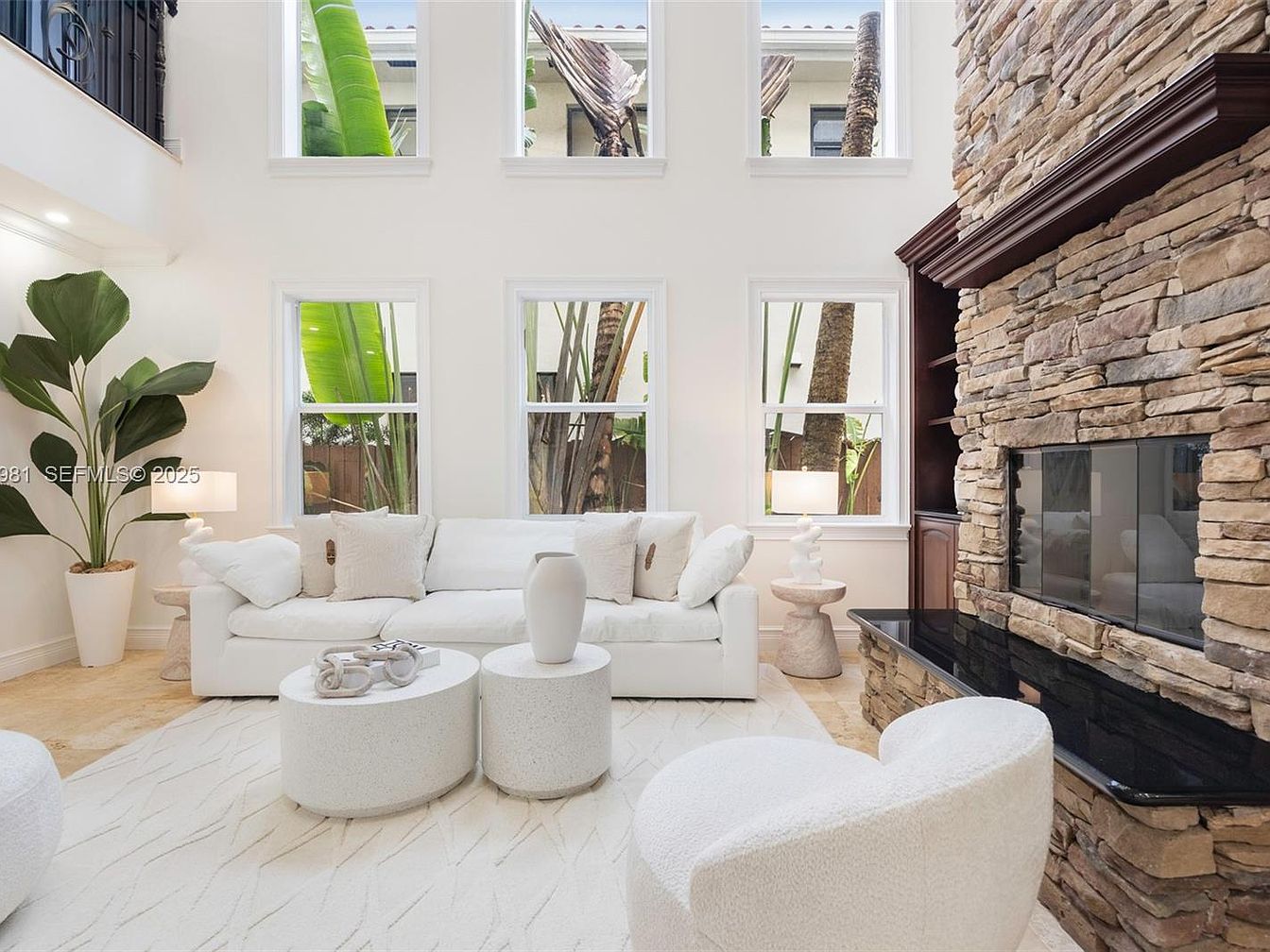 This spacious living room features high ceilings and large windows, allowing natural light to flood the space. The focal point is a striking stone fireplace, framed by dark wood cabinetry housing decorative objects. A soft, neutral color palette predominates with a white sectional sofa adorned with light cushions, providing a comfortable seating area. Two plush, round armchairs complement the sofa, placed atop a textured area rug. Elegant lighting fixtures and modern decor accentuate the room’s contemporary aesthetic, while warm, earthy tones from the stone contrast with the sleek surfaces, creating a harmonious blend of comfort and sophistication.