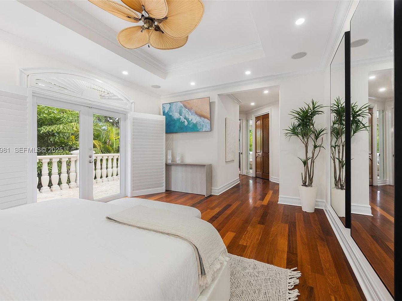 This luxurious bedroom features a serene atmosphere, highlighted by a sophisticated wood floor that contrasts beautifully with the light-colored walls. A large ceiling fan with leaf-shaped blades adds a tropical touch, while ample natural light floods through double French doors, offering views of lush greenery outside. A minimalistic bed adorned with a soft blanket lies against one wall, complemented by a textured area rug. A sleek, modern dresser and an eye-catching artwork piece enhance the decor without overwhelming the space. Floor-to-ceiling mirrors reflect light and amplify the room’s spaciousness, creating an inviting and relaxing retreat.