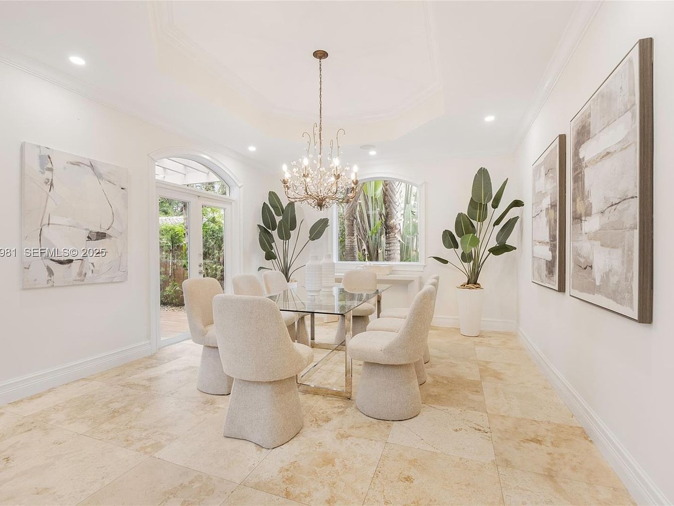 This elegant dining room features a glass table surrounded by plush, rounded chairs, enhancing comfort and modernity. The soft neutral palette of whites and beiges creates a serene atmosphere, complemented by the light-colored stone flooring that reflects natural light. An intricate chandelier hangs gracefully from the ceiling, adding sophistication. Two large windows allow ample light and provide views of lush greenery outside, while tall potted plants in the corners bring a touch of nature indoors. Abstract artwork adorns the walls, contributing a contemporary artistic flair, balancing the room’s grandeur with a sense of tranquility.