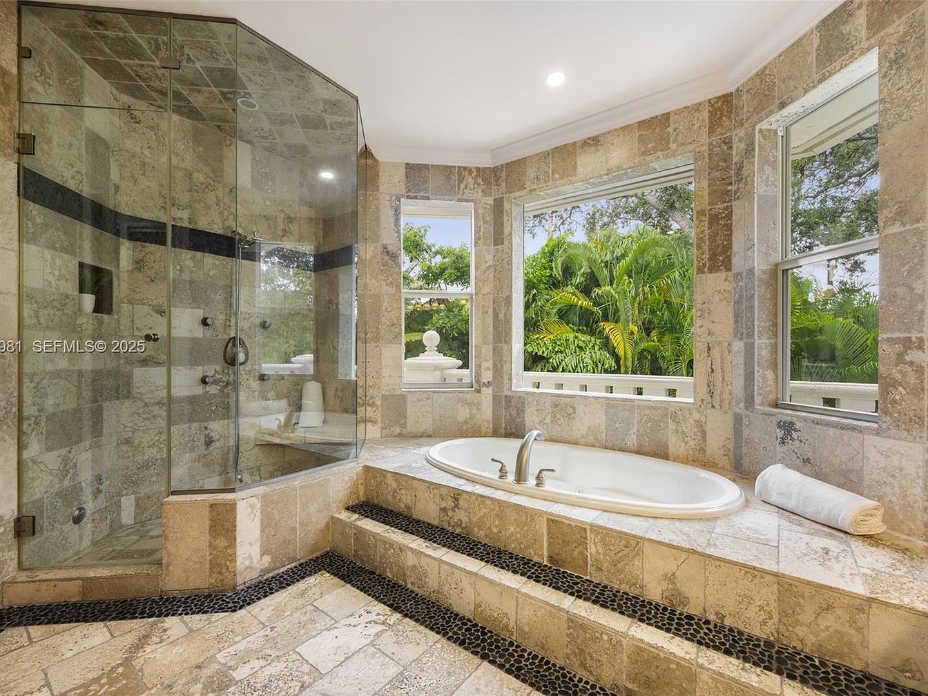 A luxurious bathroom featuring a curved soaking tub positioned beneath large windows, allowing natural light and views of lush greenery. The space showcases rich, textured stone tiles in warm beige and gray tones, harmonizing with sleek glass shower panels. A modern rainfall showerhead and multiple body jets enhance the spa-like experience. The room’s layout includes a distinguished step-down area around the tub, bordered by dark pebble-patterned tiles, adding an elegant contrast. Delicate white accents, such as a rolled towel, create a serene atmosphere, while the overall design emphasizes comfort and tranquility within this private retreat.