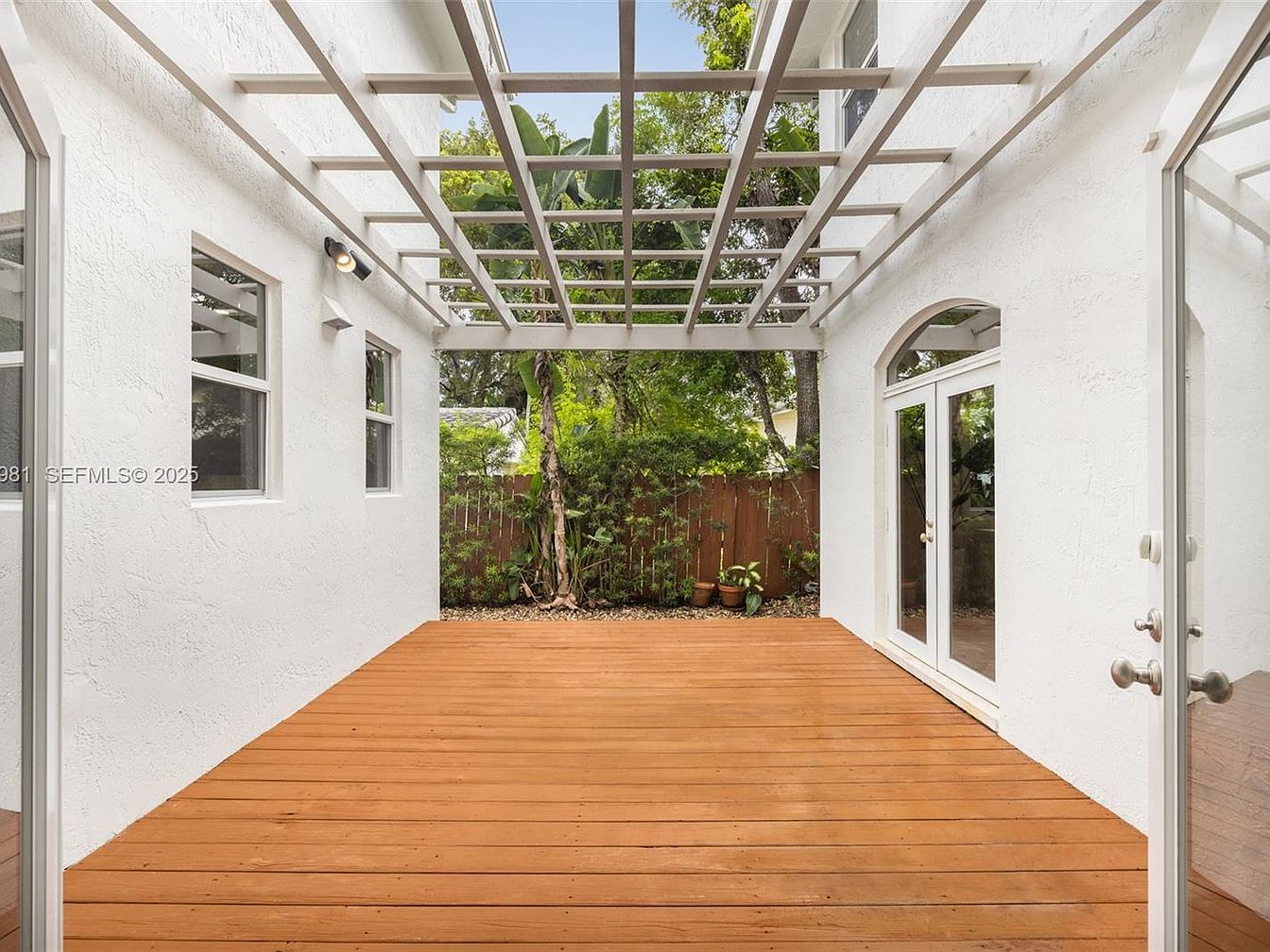 This outdoor patio features a wooden deck surrounded by clean, white walls, creating a bright and airy atmosphere. A pergola overhead allows for dappled sunlight, enhancing the space’s relaxation potential. Large glass doors provide easy access to the home, accentuating the seamless indoor-outdoor flow. The earthy tones of the hardwood deck contrast beautifully with the light color of the walls, while strategically placed windows invite natural light. Lush greenery and plants are visible in the background, contributing to a tranquil ambiance ideal for social gatherings or quiet contemplation in nature.