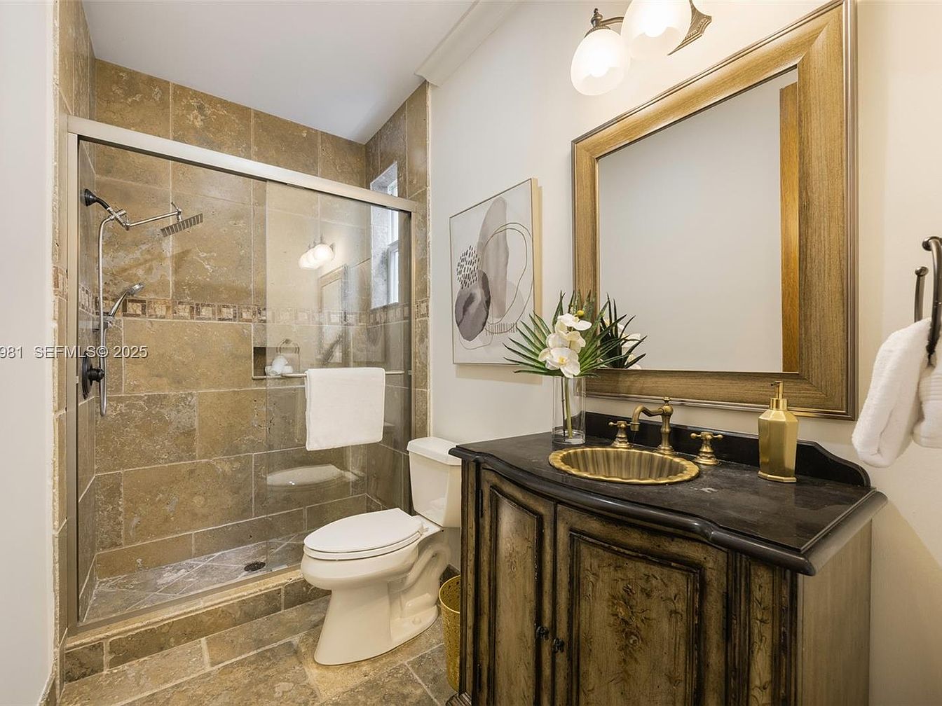 This bathroom features a stylish blend of modern and classic design elements. The color scheme revolves around warm earth tones, with stone tiles covering the walls and floor. A glass-enclosed shower is adorned with elegant fittings, including a rain shower head and a subtle tile border. A vintage-inspired vanity has a dark countertop with a unique golden sink, and intricately carved wooden cabinetry adds character. A large framed mirror above the sink amplifies the light from two globe-shaped sconces. Decorative touches, such as a vase with fresh flowers, enhance the refined atmosphere of the space.