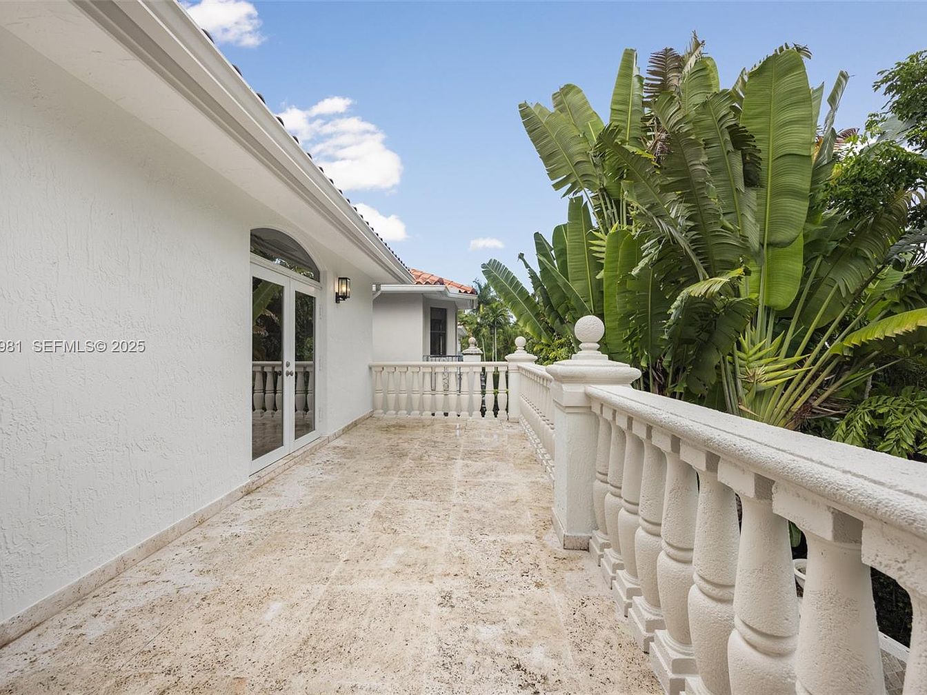 A spacious balcony showcases a clean, contemporary design with smooth, light-colored stucco walls. The flooring consists of elegant, light marble tiles, enhancing the openness of the area. Railings are adorned with classic balusters, offering a touch of sophistication while providing safety. Sunlight filters through large glass doors, creating a bright and airy atmosphere. Lush greenery fills the background, with tall tropical plants framing the space, adding vibrant natural hues. The ceiling features subtle architectural detailing, enriching the aesthetics. Overall, this balcony is a serene outdoor retreat, perfect for enjoying warm breezes and scenic views.