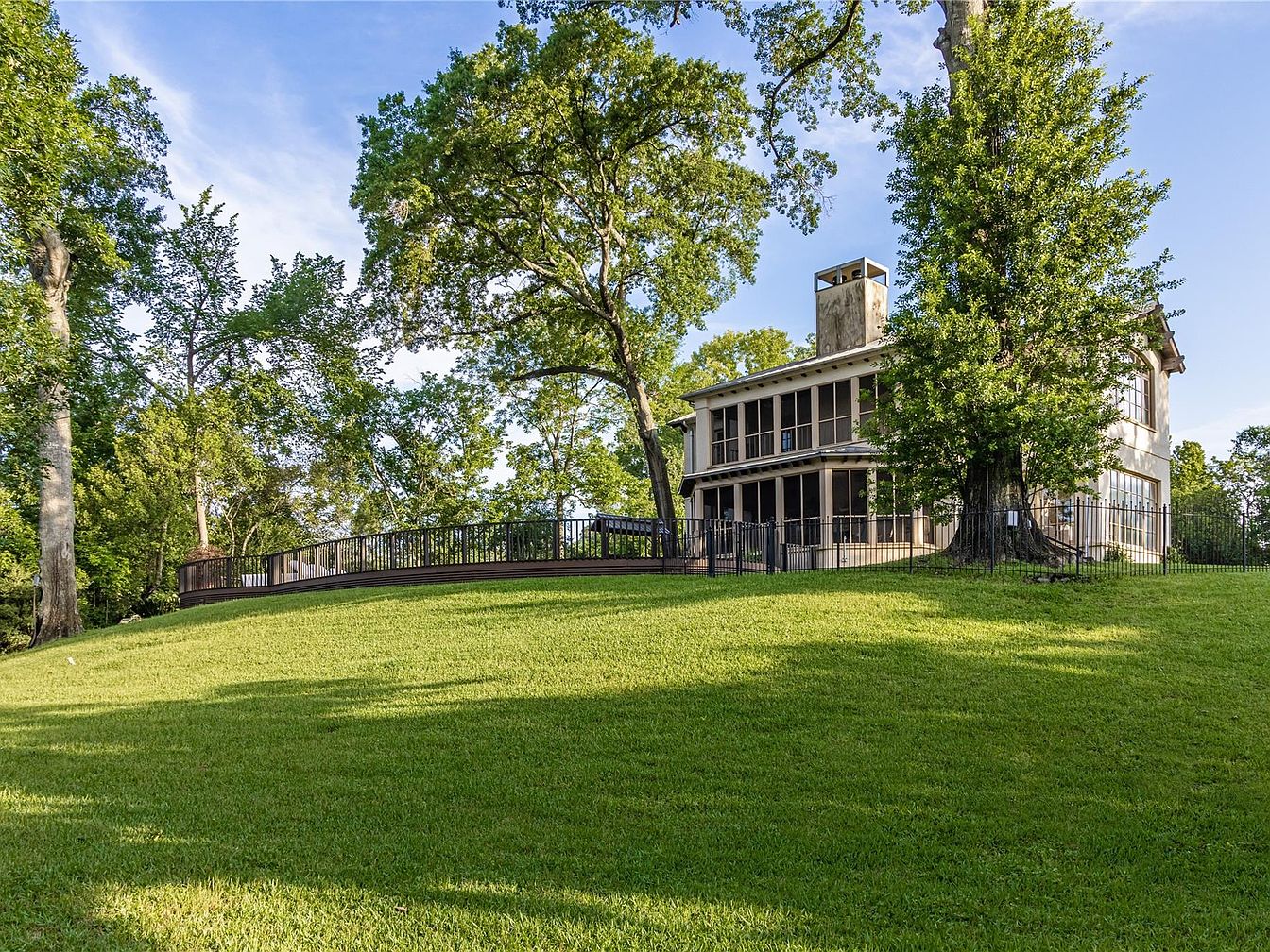 A spacious, gently sloping backyard features lush, bright-green grass leading up to a two-story American home, partially shaded by mature trees. The house displays a rustic charm with a light-colored exterior, a prominent screened porch on both floors, and a striking chimney tower. Black metal fencing adds a layer of security, making the space ideal for children and pets to play safely. Wide open grounds are perfect for outdoor family gatherings or recreational activities. The setting exudes a sense of tranquility and privacy, surrounded by wooded areas and bathed in soft, natural sunlight.