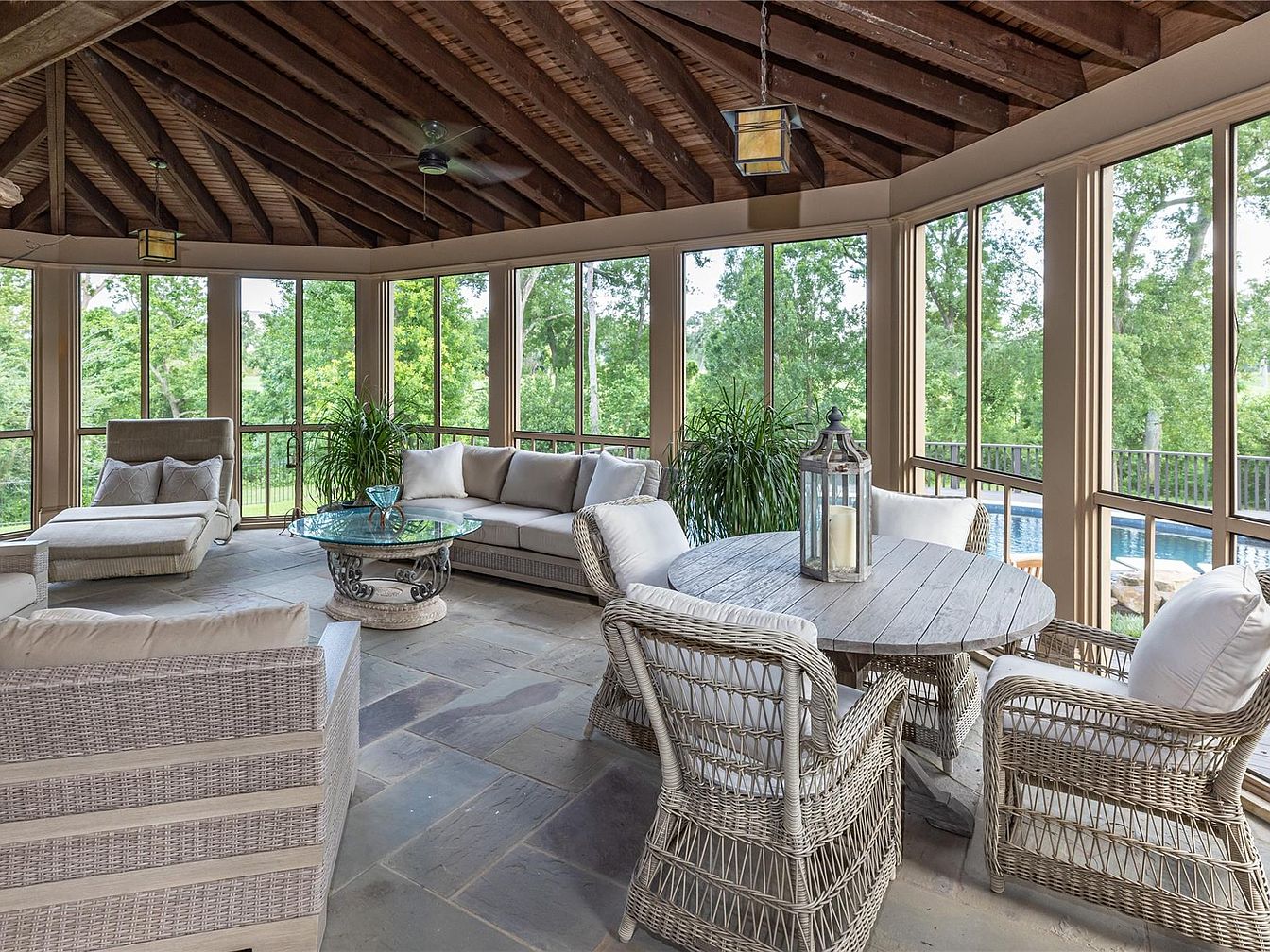 This spacious screened porch offers a serene retreat ideal for family gatherings and relaxation. Large floor-to-ceiling windows frame lush views of the surrounding greenery and let in ample natural light. The high vaulted ceiling with exposed wooden beams adds rustic charm, while neutral-toned wicker and rattan furniture enhance comfort and durability – perfect for kids and adults alike. There is a cozy sectional sofa, single lounge chair, glass coffee table, and a round wooden dining table with matching cushioned chairs, encouraging both conversation and family meals. Potted green plants and decorative lanterns introduce a warm, inviting atmosphere to the space.