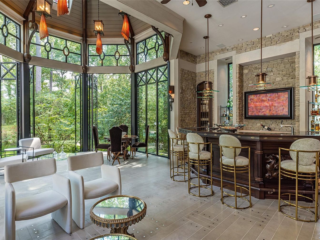A luxurious sunroom bar features floor-to-ceiling windows with elegant geometric iron frames, bathing the space in natural light and offering uninterrupted views of lush, green woodlands. The room combines a rustic stone accent wall with sophisticated woodwork, centering around a curved dark wood bar topped with ornate gold and cream barstools. A cozy seating area includes modern white armchairs and glass-topped side tables, encouraging relaxation and conversation. Overhead, unique pendant lights with orange shades add warmth and visual interest. The open layout and inviting furnishings make this space ideal for family gatherings and entertaining in a bright, natural setting.