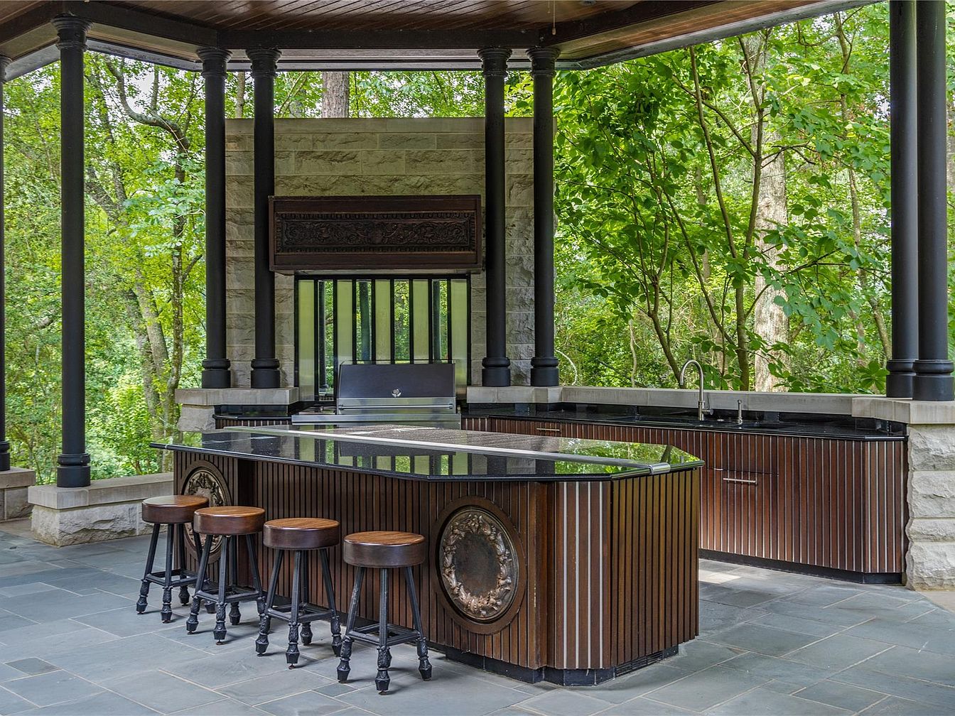 A luxurious outdoor kitchen nestled under a covered patio, framed by thick black columns and surrounded by lush green trees for a serene, private feel. The space features a large, curved island with dark wood paneling and ornate metal medallions, topped with gleaming black granite. Four sturdy wooden barstools line one side, perfect for family gatherings or casual dining. The kitchen area wraps around in an L-shape with ample counter space, built-in grill, and a modern sink, making it both practical and elegant for entertaining. Natural stone flooring and textured stone walls enhance its inviting yet refined ambiance.