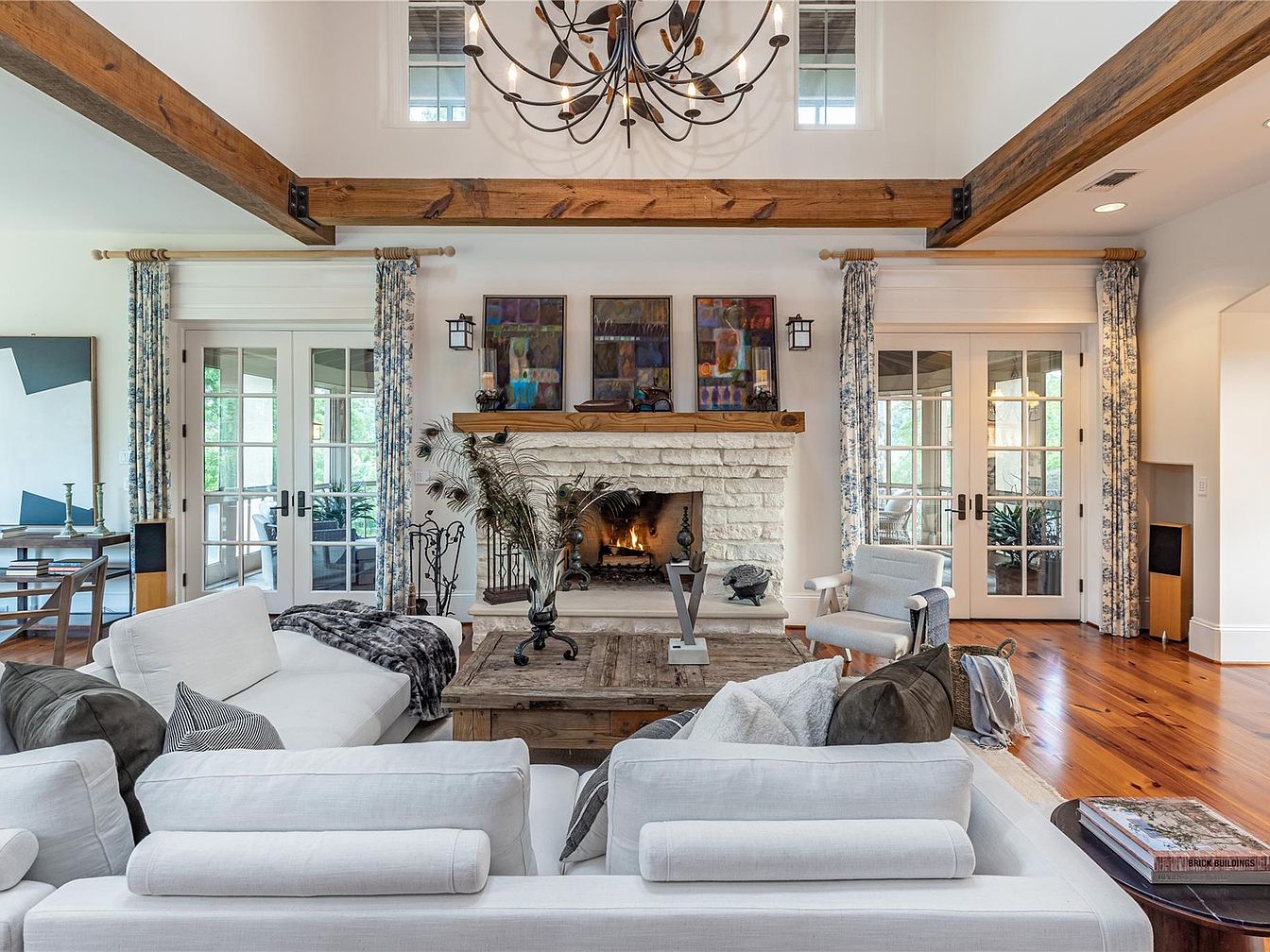A spacious family living room centers around a white stone fireplace with a rustic wooden mantel, adorned with eclectic art and natural decorations. Exposed wooden ceiling beams and a large, elegant wrought iron chandelier provide a warm, welcoming ambiance. Light pours in through double French doors framed by floral curtains, enhancing the airy feel. Comfy white sectional sofas with plush pillows and a wooden coffee table offer plenty of seating for family gatherings. The wood floors add natural warmth, and subtle decorative touches create a cozy, inviting atmosphere ideal for relaxing or entertaining with loved ones.