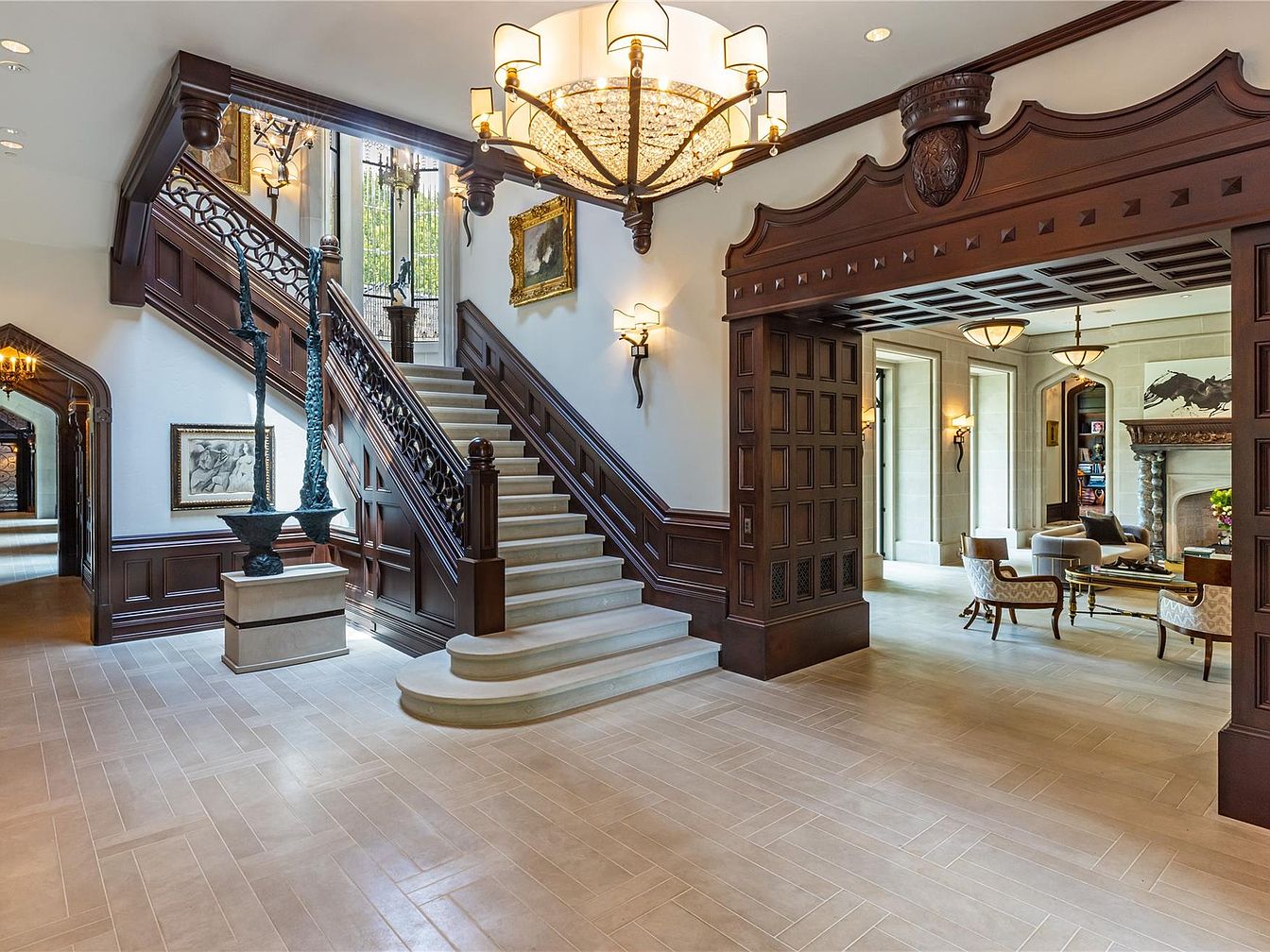 Spacious and welcoming, the grand foyer features a sweeping staircase with intricately carved dark wood railings and polished cream-colored steps, setting an elegant tone for the home. Large, luminous tile flooring adds warmth and durability, ideal for families with children. The high ceiling is adorned with a sophisticated, multi-tiered chandelier, while the walls are accented with detailed wood paneling and classic framed artwork. An open archway leads into a sunlit sitting room with plush, family-friendly seating, a grand fireplace, and built-in bookshelves, fostering both comfort and style. This foyer creates an inviting, functional transition space perfect for family gatherings and entertaining guests.
