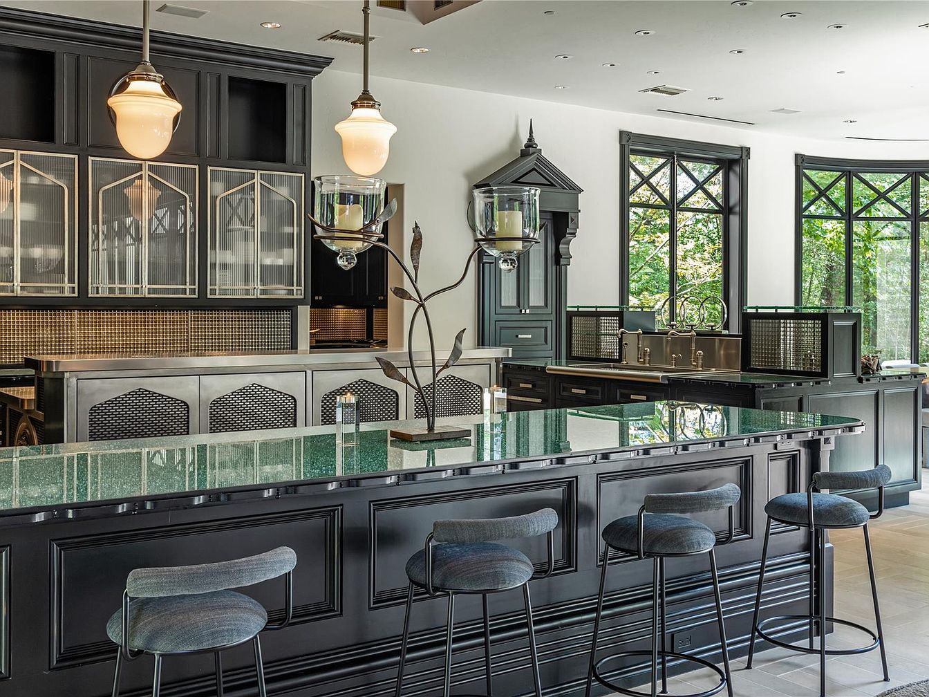 A spacious, elegant kitchen island anchors this open-concept kitchen, featuring a glossy green countertop that reflects natural light streaming through tall corner windows. The island is flanked by four sleek blue-gray upholstered bar stools, inviting the whole family to gather for meals or homework. Sophisticated cabinetry in deep charcoal with glass-front doors offers ample storage, complemented by metallic mesh detailing and subtle gold-tiled backsplash. The curved windows framed in bold black lend architectural interest, while large pendant lights and decorative candle holders add warmth. The overall palette balances moody modern tones with light flooring, creating a welcoming atmosphere perfect for family living.