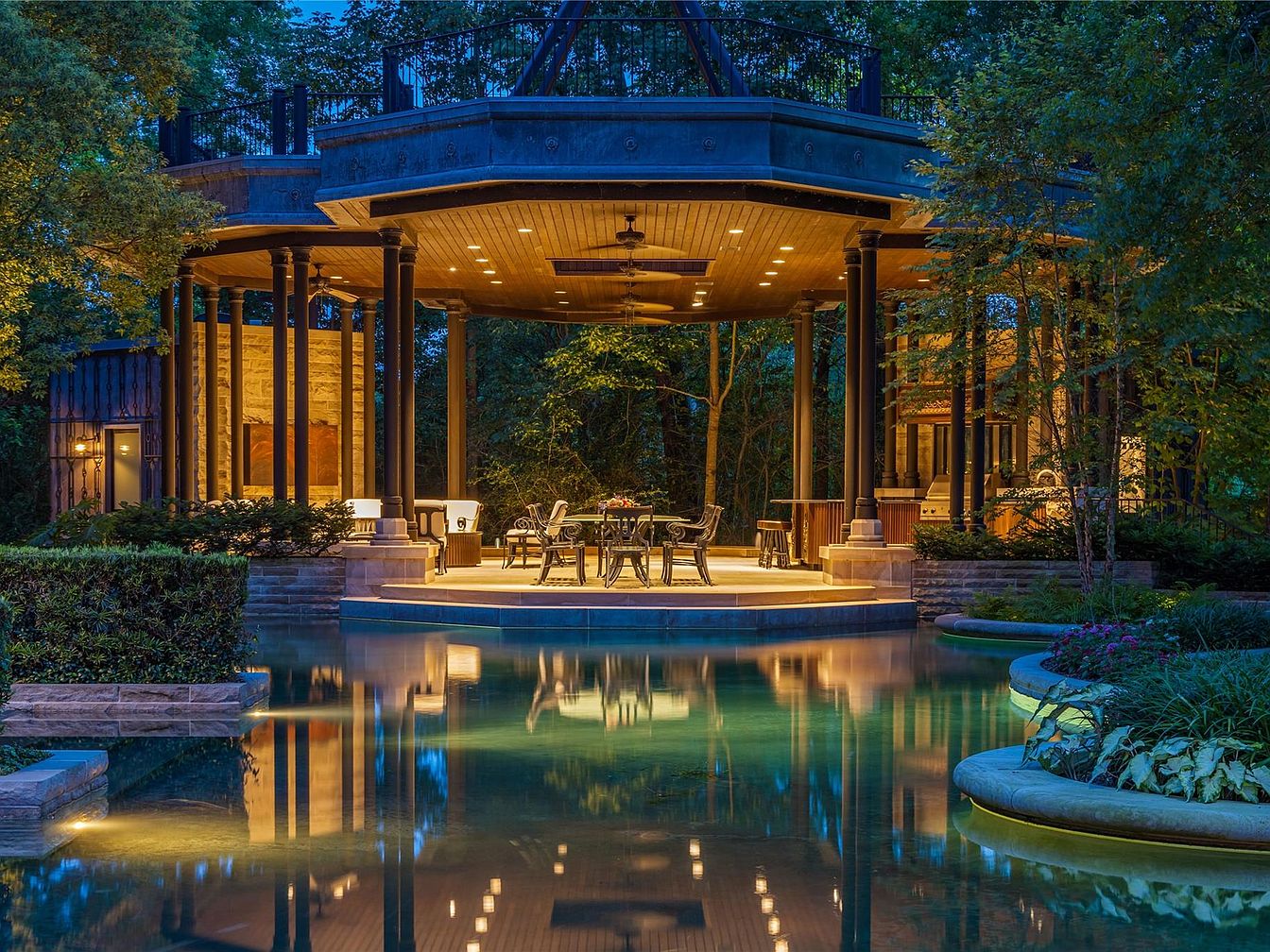 A spacious outdoor pavilion is featured, illuminated by warm, recessed lighting in the evening, ideal for family gatherings or entertaining guests. Surrounded by lush greenery and mature trees, the pavilion overlooks a tranquil reflecting pond with soft underwater lights, adding to the serene ambiance. Stylish black columns support a wooden ceiling with fans for comfort on warm days. Elegant outdoor seating, including a dining table and lounge sets, provide ample space for meals and conversation. The setting offers privacy, safety with level walkways, and beautiful landscaping, making it both child-friendly and visually inviting for all family members.