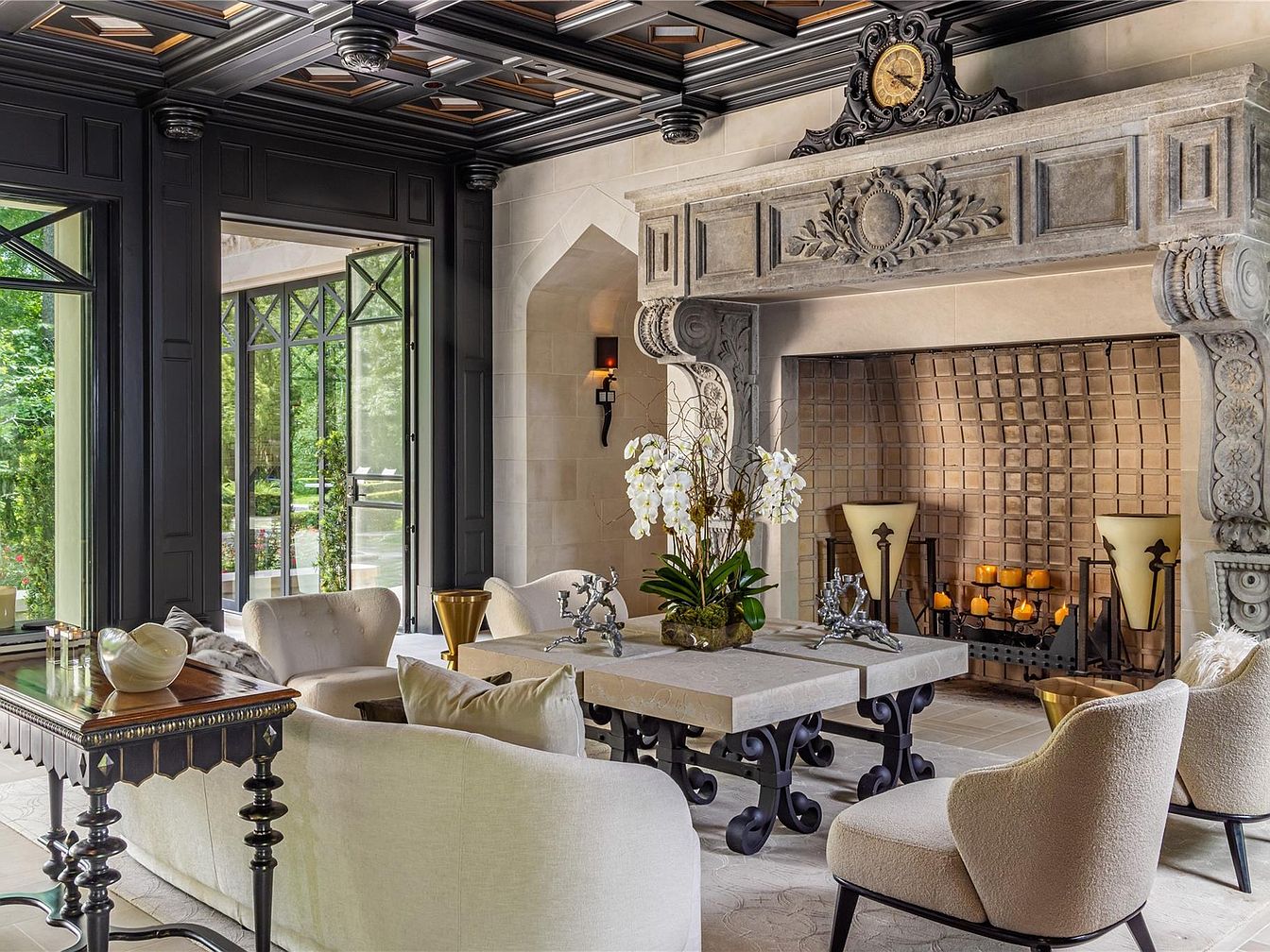 Spacious living room centered around an ornate stone fireplace with classical carvings and a prominent clock on the mantel. Plush cream-colored sofas and armchairs are arranged for easy conversation, accented with soft pillows, making the space inviting for families to gather. A large stone coffee table displays a white orchid arrangement, adding freshness. The room features a richly detailed, dark coffered ceiling and matching wall trim, contrasting with the pale stonework. Natural light streams in through large glass doors revealing the green outdoor view, creating a warm and welcoming environment ideal for relaxation or socializing.