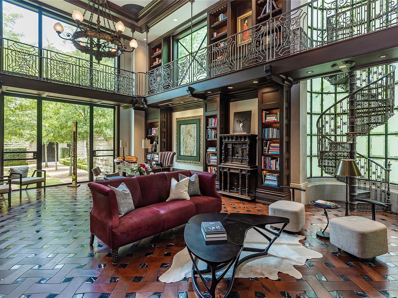 This breathtaking living room serves as a warm gathering space for families, featuring soaring double-height windows that flood the area with natural light and offer serene views of the landscaped garden. The space showcases an elegant mix of classic and modern aesthetics, with rich wood herringbone floors, plush burgundy seating, soft gray ottomans, and a striking black metal spiral staircase leading to a book-filled loft. Ornate wrought-iron railings and a grand chandelier give a sense of timelessness and sophistication. Ample shelving, cozy seating, and an open layout encourage family reading or conversation, making it an inviting retreat for all ages.