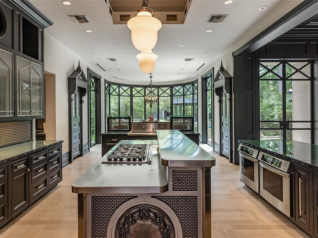 A spacious kitchen features a large, central kitchen island with a built-in cooktop and modern stainless steel surface, ideal for family meal preparation or casual gatherings. Floor-to-ceiling windows along two walls fill the room with natural light and showcase a serene, wooded view, creating an inviting atmosphere for all ages. Dark cabinetry contrasts with pale tile flooring, providing ample storage and a sleek, contemporary aesthetic. Pendant lights hang above the island, adding a warm glow. Double ovens and abundant countertop space ensure convenience and efficiency, while the open layout encourages easy movement and interaction, perfect for a busy family lifestyle.
