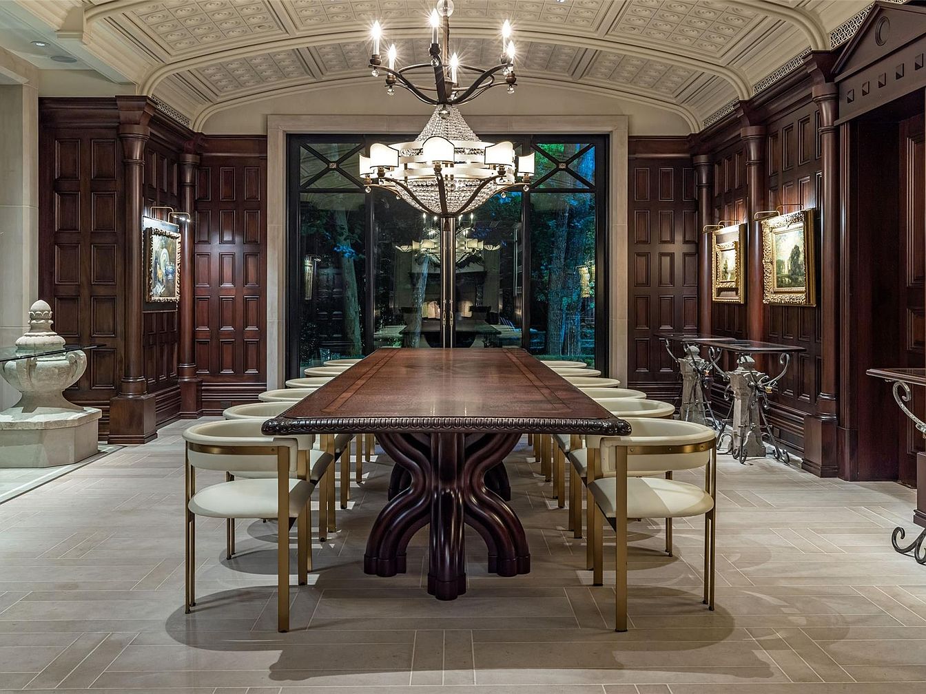 A grand dining room features a long, elegant table with a unique carved wooden base, surrounded by twelve modern cream-colored chairs with gold accents, offering ample space for large family gatherings. The space impresses with rich, dark wood wall paneling and columns, creating a warm and sophisticated environment. The ceiling boasts intricate white coffering, and a dazzling chandelier serves as the room’s centerpiece, adding both light and luxury. Large windows at the end of the room look out onto lush greenery, while framed artworks and stylish metal side tables add character. The neutral stone flooring complements the overall refined ambiance.