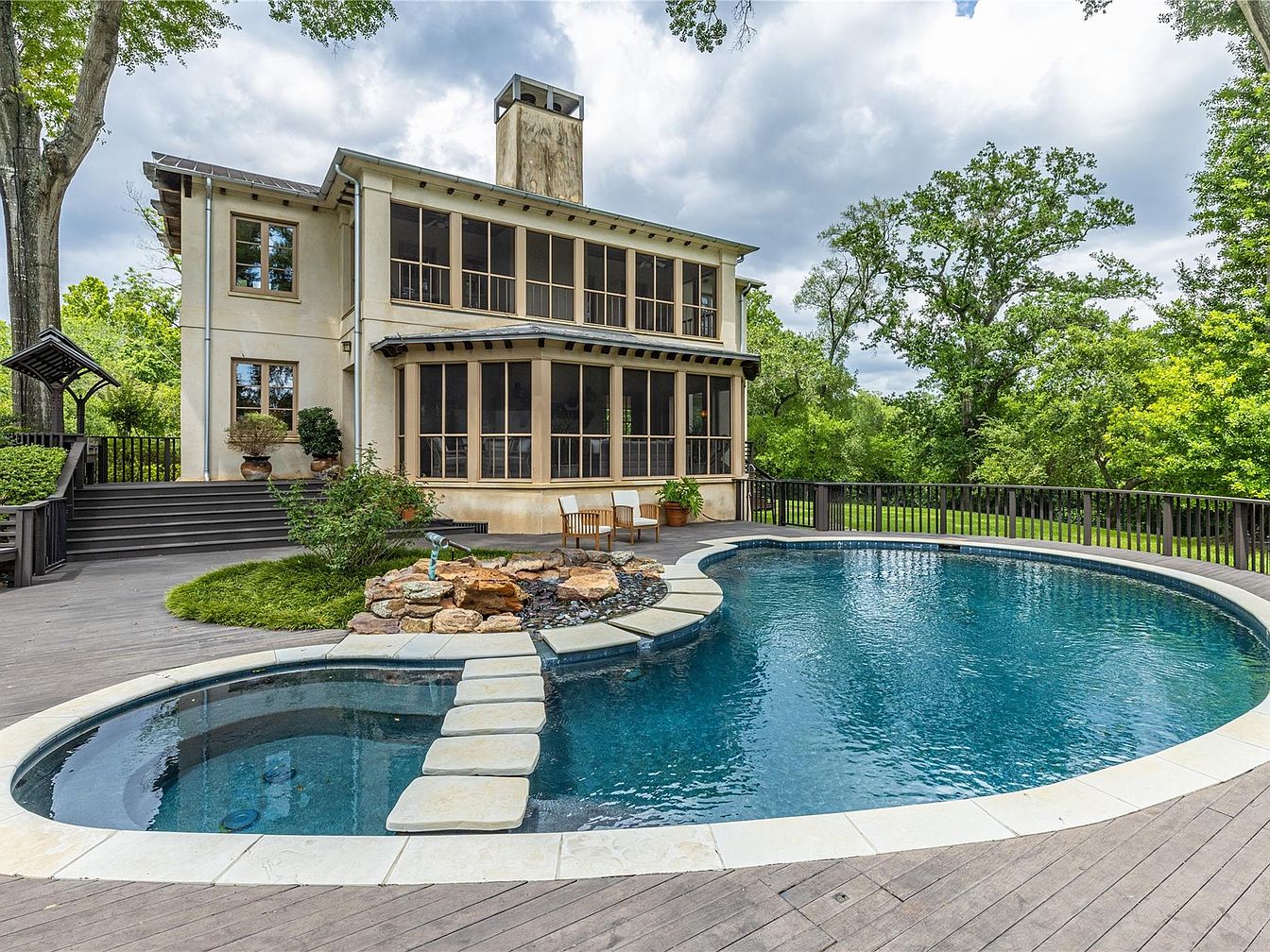A spacious and inviting backyard showcases a beautiful, organically shaped swimming pool framed by a wide light stone border and surrounded by dark wood decking. The pool has a unique design with a shallow stone walkway that leads to a small rock waterfall feature. Adjacent to the pool, there’s a seating area with comfortable chairs, perfect for family gatherings or watching children play. The two-story home features large screened porches and a light beige exterior, complementing lush landscaping with mature trees and potted plants. Fenced for safety and privacy, the area offers a tranquil, family-friendly oasis for relaxation and outdoor fun.