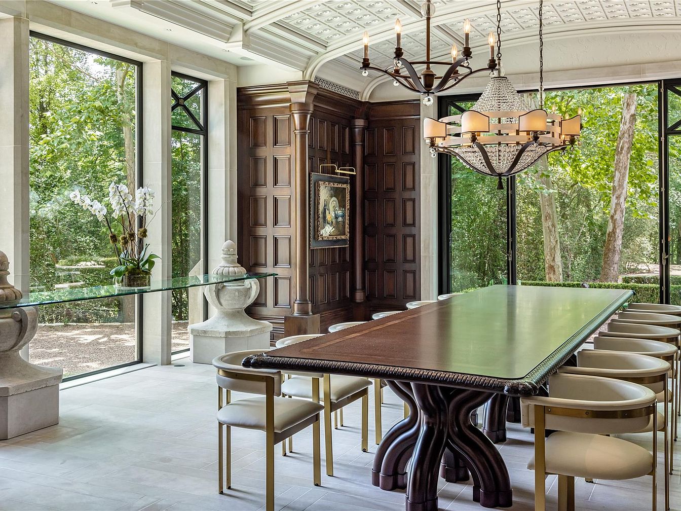 A grand dining area features a long wooden table with softly curved, padded chairs suitable for large family gatherings or entertaining. Floor-to-ceiling windows on two sides flood the space with natural light and offer lush views of mature trees and greenery, creating a serene backdrop. The room’s decor blends traditional elegance and contemporary openness: detailed wood panelling adds a sense of warmth and luxury, while ornate stone urns and a modern chandelier introduce sophistication. The airy light color palette, with beige floors and neutral tones, makes this space welcoming, functional, and ideal for creating family memories.