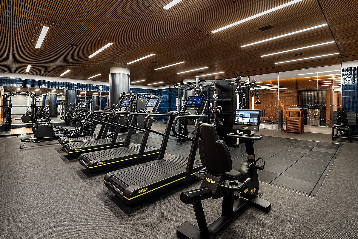 The fitness center features a modern layout with a variety of cardio and weight training equipment. Treadmills and exercise bikes are arranged neatly, showcasing sleek black frames and digital displays for tracking workouts. The space is well-lit with overhead LEDs, accentuating the smooth lines of the wood-paneled ceiling. Large mirrors enhance the sense of space and reflect the fitness machines. Dark rubber flooring provides durability and comfort while absorbing sound. A wooden partition in the background hints at additional facilities, promoting a cohesive yet functional atmosphere for exercise enthusiasts. Overall, the aesthetics blend functionality with contemporary design.