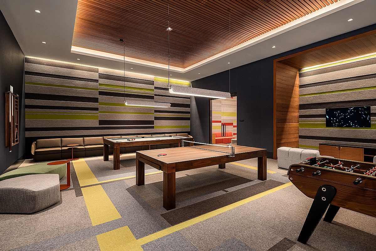 This vibrant game room features a mix of playful colors and modern design. The walls are adorned with textured panels in varying shades of gray, green, and brown, creating a lively backdrop. The flooring is a patchwork of neutral tones interspersed with bold yellow lines, guiding movement through the space. A large wooden table stands at the center, perfect for other games, alongside a foosball table. Comfortable seating includes a brown leather couch and unique, sculptural ottomans. Warm pendant lights and recessed ceiling fixtures provide ample illumination, enhancing the room’s energetic atmosphere.