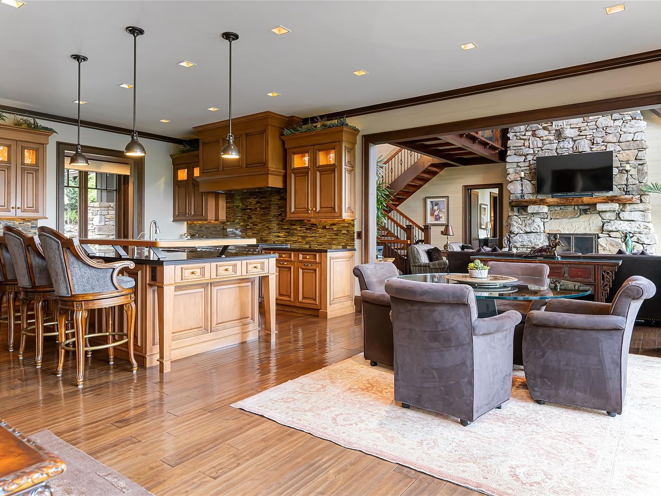 Spacious open concept kitchen and living area seamlessly blend together, perfect for family gatherings. The kitchen features warm wooden cabinetry, a large island with comfortable bar stools, and modern pendant lighting above. Sleek granite countertops and a stylish mosaic backsplash provide a sophisticated touch. The adjacent dining nook offers a round glass table with four plush, cozy upholstered armchairs positioned on a soft area rug. In the background, a welcoming living room showcases a grand stone fireplace and wood accents, with a flat-screen TV mounted above. Natural light streams through ample windows, highlighting the rich hardwood floors throughout the space.