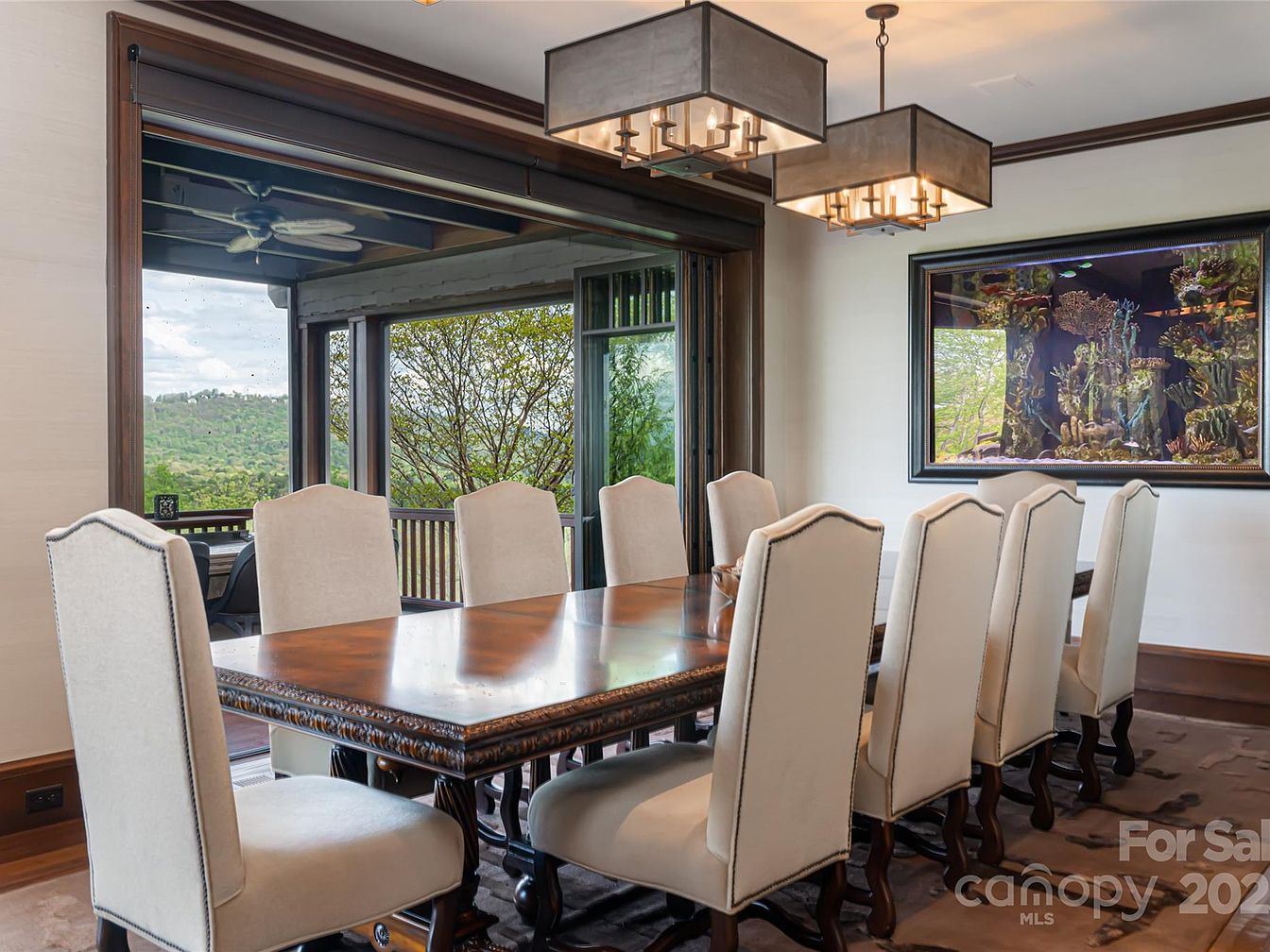A formal dining room with a large polished wooden table surrounded by ten high-back, cream-colored chairs, providing ample seating for gatherings and family meals. Warm neutral tones on the walls create a soothing and welcoming atmosphere, complemented by dark wood trim and elegant crown molding. Two geometric pendant lights hang above the table, adding a contemporary touch. One wall features a vibrant aquarium set in a black frame, bringing life and color into the space, while a large sliding glass door opens to a covered patio with views of lush greenery and rolling hills, allowing natural light to flood the room.