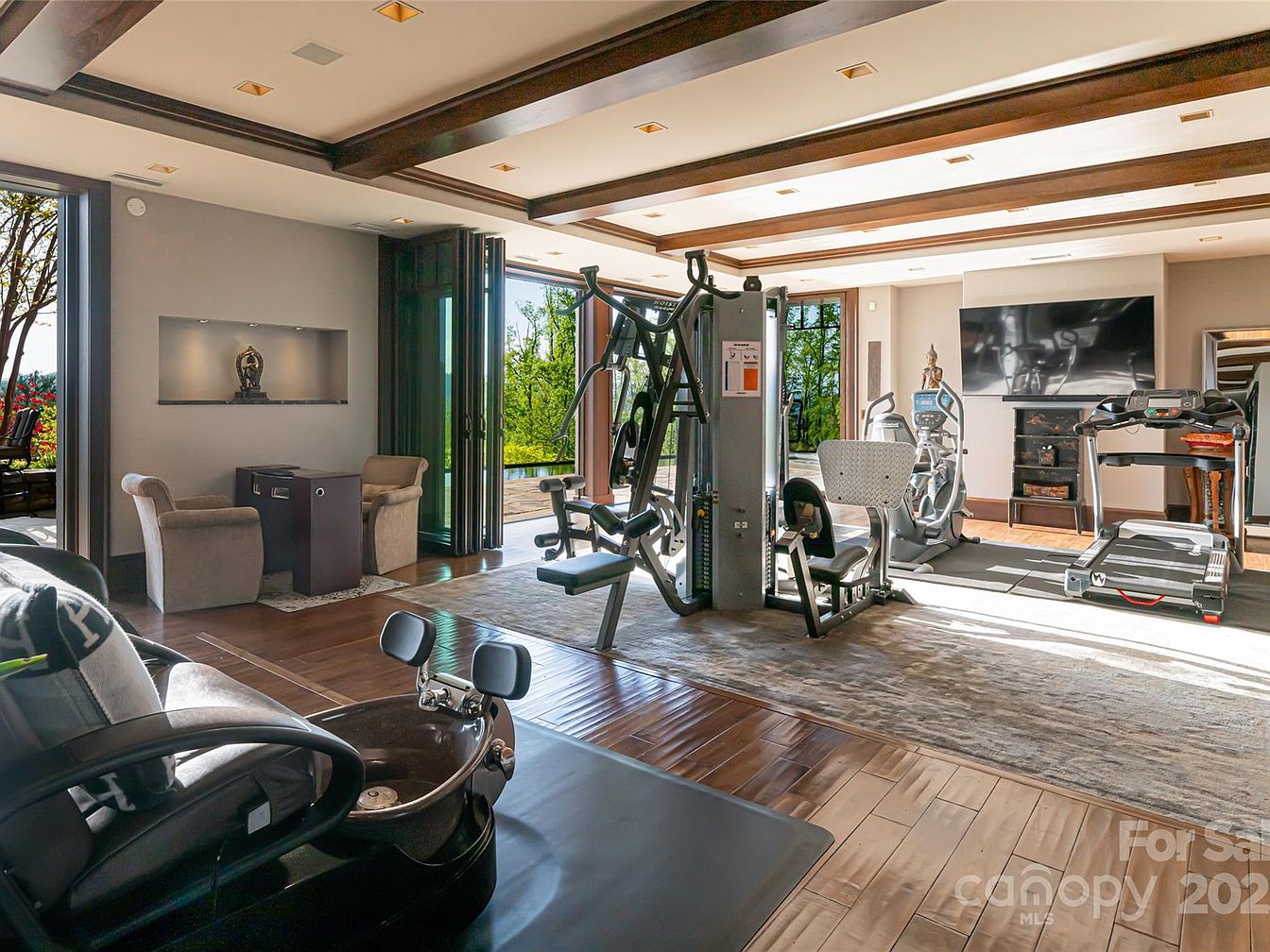 A spacious and bright home gym features warm wooden floors and exposed ceiling beams that create an inviting and contemporary atmosphere. Large sliding glass doors open to let in plenty of natural light and provide a seamless connection to the outdoors, ideal for active families or anyone looking for healthy living space. Fitness equipment, including a treadmill, elliptical, and multi-station gym, is neatly arranged on a soft area rug to ensure safety and comfort. A cozy sitting nook with two plush armchairs and a small table offers a spot for relaxation or supervision, making it welcoming for family use. Neutral tones and subtle decorative accents add to the space’s serene and sophisticated feel.