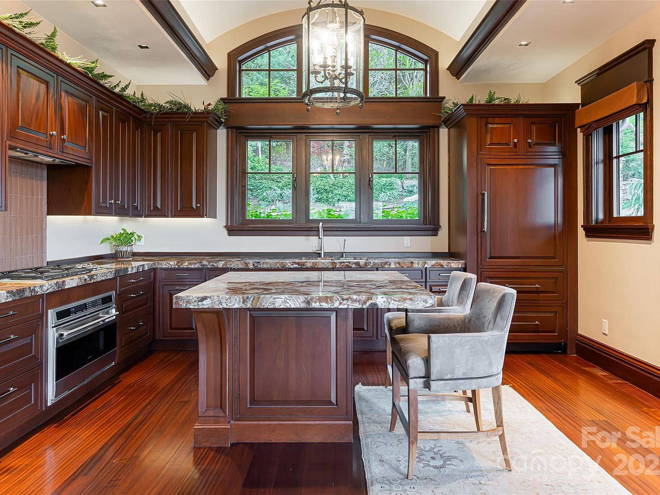 This spacious kitchen features rich, dark wood cabinetry and an elegant marble island at the center, complemented by two plush, upholstered chairs for comfortable seating. Large, arched windows above the sink flood the space with natural light and offer tranquil views of greenery, creating a welcoming atmosphere for family gatherings or meal prep. The kitchen is equipped with modern stainless-steel appliances, generous countertop workspace, and ample storage in the overhead and under-counter cabinets. The warm wood floors blend seamlessly with the cabinetry, while understated greenery and soft beige walls add an inviting, homely touch perfect for everyday family use.