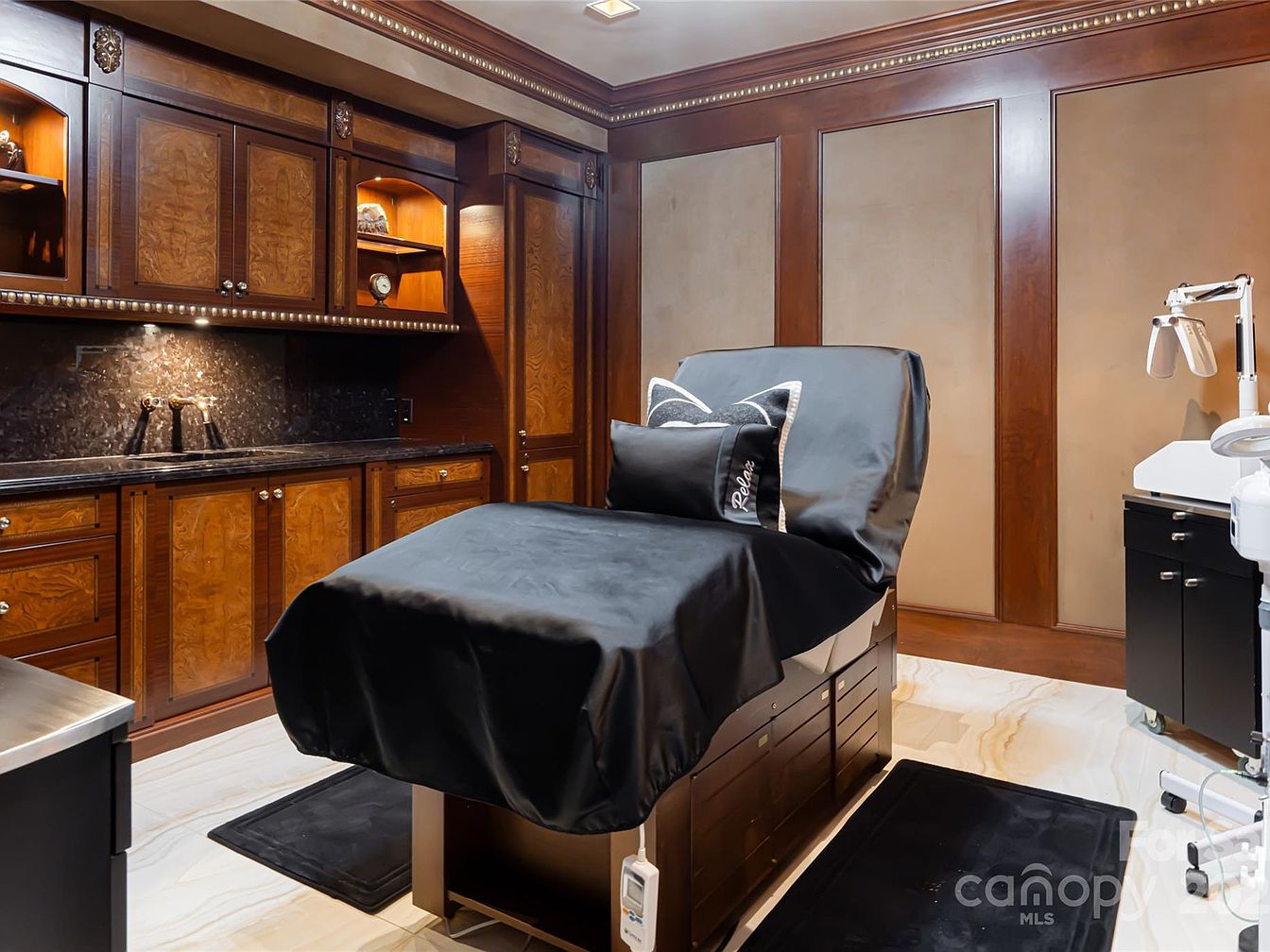 A luxurious spa room features rich wood cabinetry with intricate detailing, complemented by dark granite countertops and under-cabinet lighting that creates a calming ambiance. In the center is a plush, adjustable treatment bed draped in smooth black linens, accented by a ‘Relax’ pillow, inviting comfort and relaxation. The walls are paneled with warm, neutral tones, adding depth and elegance, while the porcelain-inspired flooring gives the space a polished, clean look. This tranquil setting is ideal for family members seeking a quiet place for wellness or self-care, combining functionality with beautifully crafted, inviting décor.