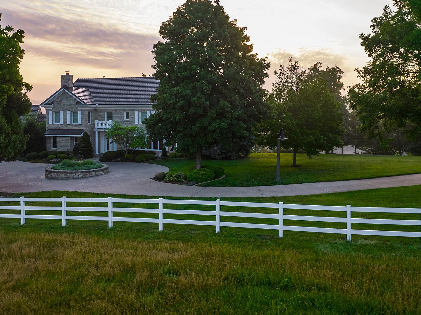 A spacious American home is set amidst vibrant green lawns and mature trees, providing a welcoming entrance ideal for families. The front yard is enclosed by a classic white wooden fence, framing a circular driveway that gently curves around a well-manicured garden with large shade trees. The house features light brickwork, large symmetrical windows with white shutters, and a covered front entry, offering a suburban yet elegant aesthetic. A serene pond and wooded area provide a peaceful backdrop, perfect for outdoor activities and gatherings. The expansive lawn offers ample space for children to play and family pets to roam safely.