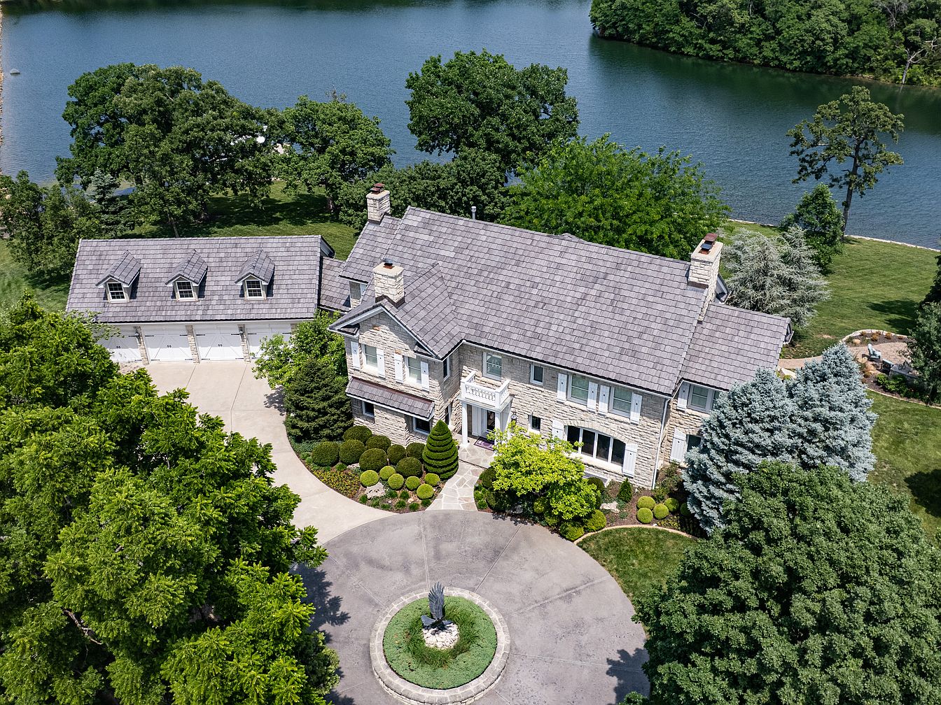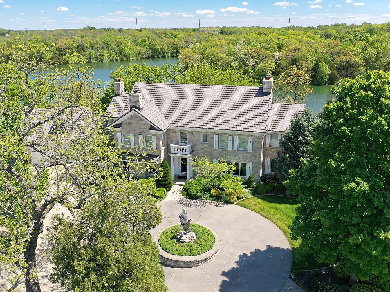 Overlooking a tranquil lake, the home’s front exterior exudes timeless elegance with classic stonework and a grand symmetrical design. A spacious circular driveway welcomes guests, featuring a landscaped center with lush greenery and sculpted shrubs, creating a stately approach perfect for family gatherings and safe play. The three-car detached garage offers ample parking and storage, emphasizing convenience for busy households. Large multi-pane windows provide abundant natural light, while mature trees and well-kept gardens surround the property, fostering privacy and a sense of peace. The calm lakeside setting and expansive lawn offer plenty of space for outdoor activities and relaxation.