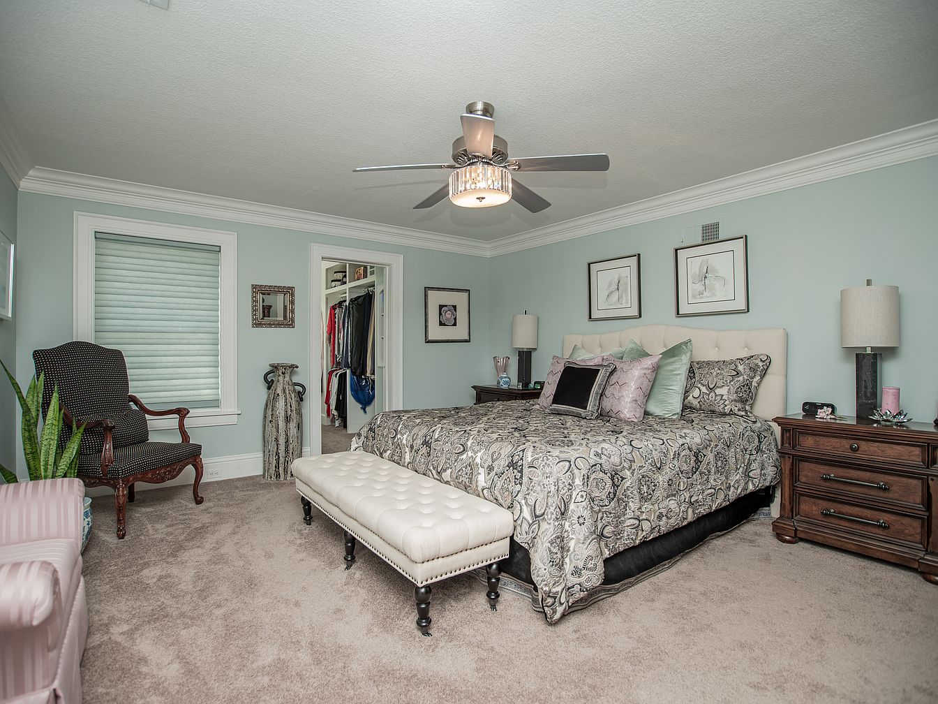 A spacious master bedroom designed with relaxation and family comfort in mind, featuring a large bed adorned with patterned bedding, multiple decorative pillows, and a tufted cream bench at the foot. Soft beige carpeting provides a cozy surface ideal for children. The room is lit by natural daylight from a large window and an elegant ceiling fan light fixture. Matching dark wood nightstands with modern lamps flank the bed, adding functionality. Light pastel green walls and crisp white trim create a soothing color palette. Family-friendly extras include a roomy walk-in closet, ample floor space, and comfortable seating with armchairs perfect for reading or bonding.