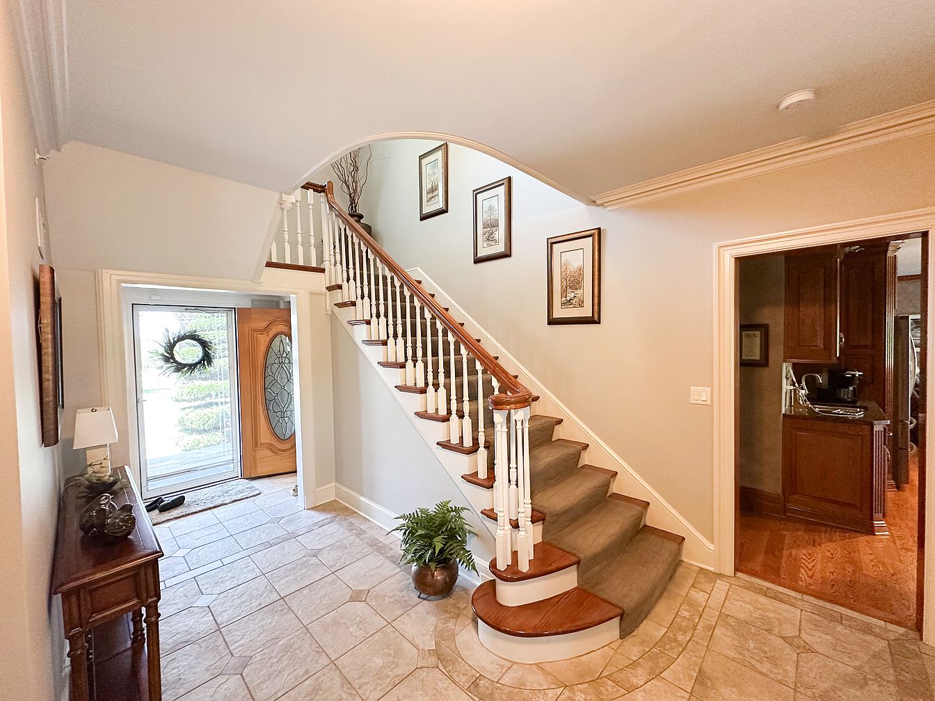 A spacious entryway welcomes guests with tiled flooring in neutral tones, paired with soft beige walls and white crown molding for timeless appeal. The curved staircase, featuring wooden steps with a carpet runner and classic white spindles, creates a grand yet inviting impression for families. Natural light streams through the glass front door, which showcases an elegant oval window with decorative frosting. A small wooden console table sits to the left, holding a lamp and decorative pieces, while leafy plants and framed artwork add warmth. The open layout ensures easy navigation and a safe, welcoming atmosphere for all ages.