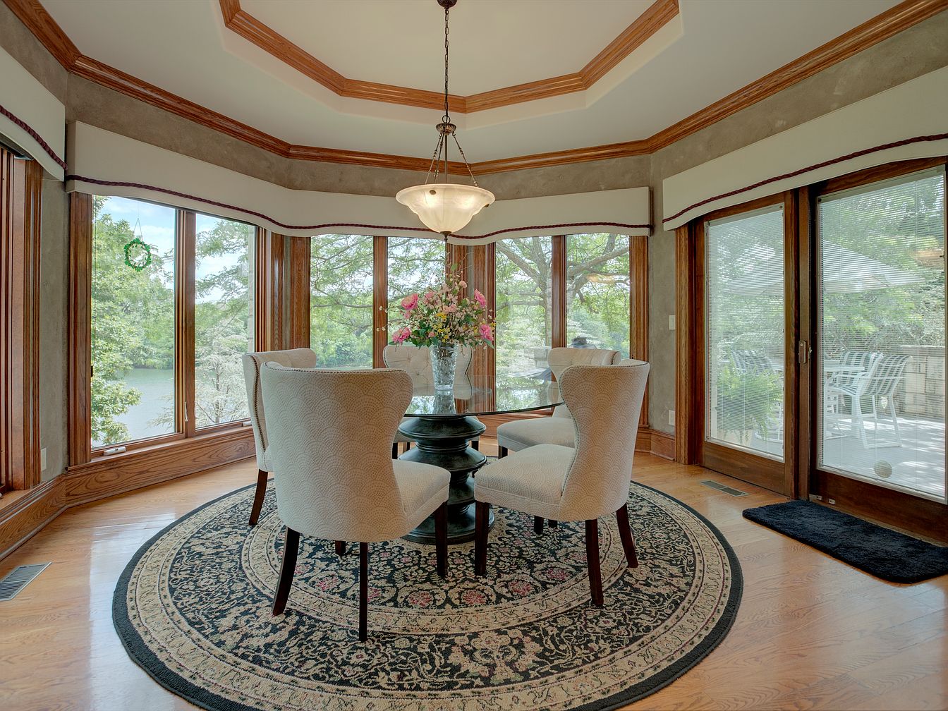 A bright and inviting breakfast nook featuring a round table surrounded by four upholstered chairs with gentle curves, perfect for family meals or morning coffee. The space is encircled by expansive floor-to-ceiling windows that offer sweeping views of lush greenery and a serene lake, creating a peaceful, nature-inspired atmosphere. A large, patterned round rug anchors the table and adds warmth to the natural wood flooring. Soft neutral tones and rich wood trim throughout the room highlight an elegant yet welcoming ambiance. Overhead, a stylish pendant chandelier casts a warm glow, and large glass doors open to a family patio area.