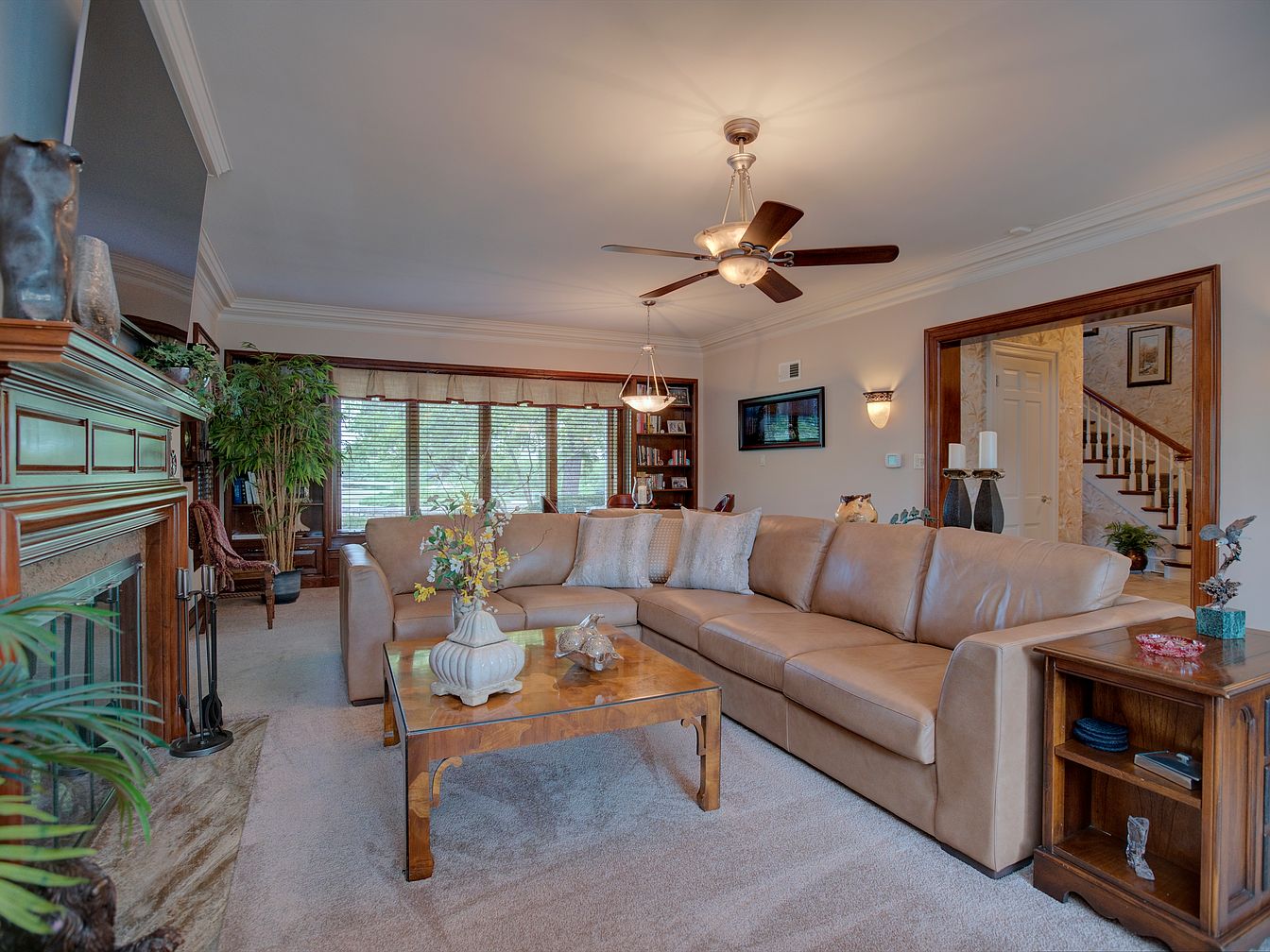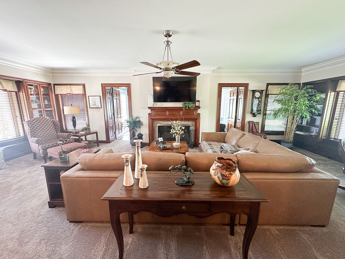 Spacious living room featuring a large L-shaped tan leather sectional sofa that invites family gatherings and relaxation. The soft, plush carpeting underfoot ensures comfort for kids at play. A wooden coffee table topped with flowers and accent pieces sits at the room’s center, balanced by a matching wooden side table. The fireplace, with its intricate wood trim, creates a warm focal point perfect for cozy evenings. Tall windows covered with blinds line the back wall, filling the room with natural light, while indoor plants and tasteful décor add welcoming touches. Neutral tones and classic crown molding complete the inviting, elegant ambiance.
