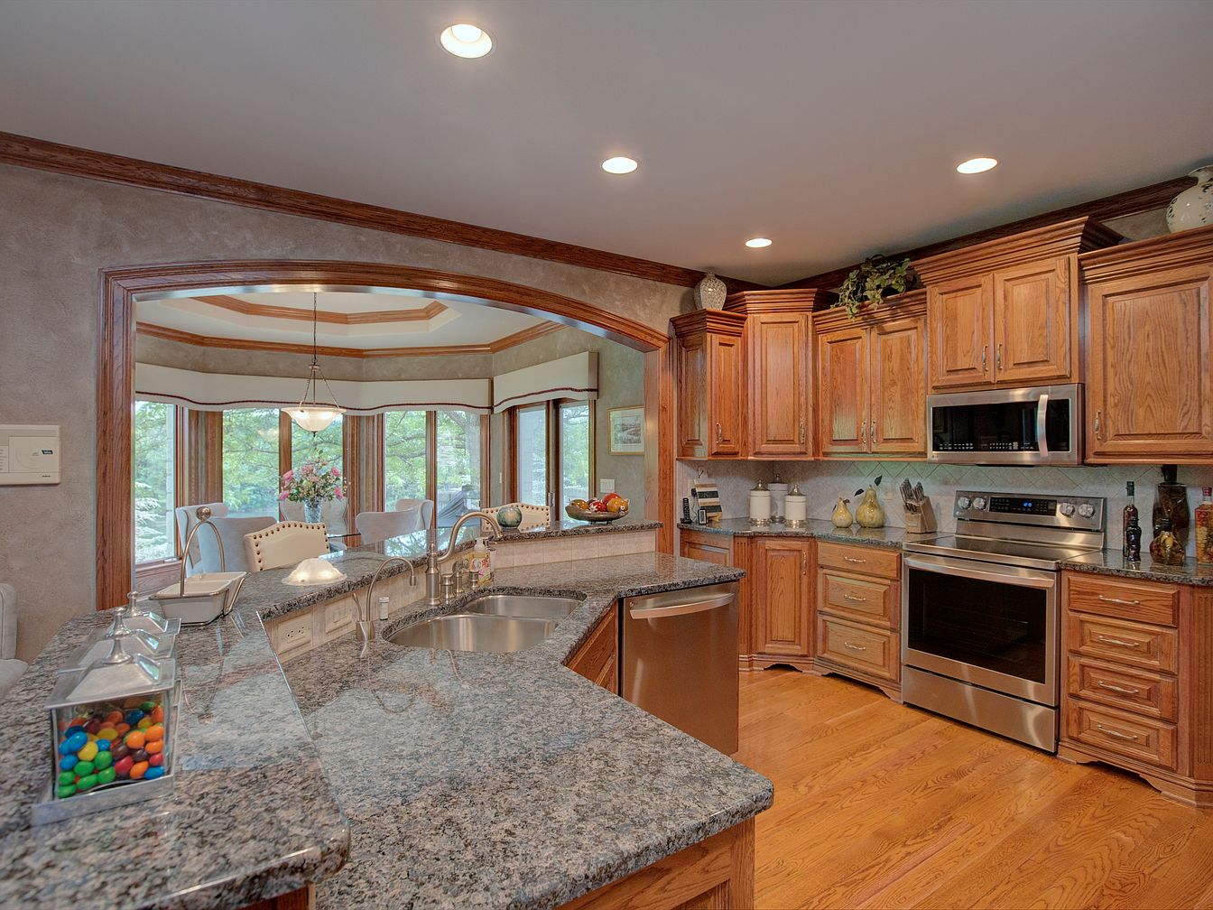 Spacious open kitchen featuring warm wooden cabinetry, granite countertops, and stainless steel appliances, designed for both style and function. The kitchen layout includes a large L-shaped island with a double sink and seating area, making it perfect for family gatherings and casual meals. Recessed lighting and large windows bring in natural light, creating a welcoming atmosphere. The breakfast nook, visible through a wide arched opening, features a bay window with a round table and upholstered chairs, ideal for family breakfasts. Muted earth tones, crown molding, and tasteful decor enhance the inviting, family-friendly ambiance of this heart-of-the-home space.