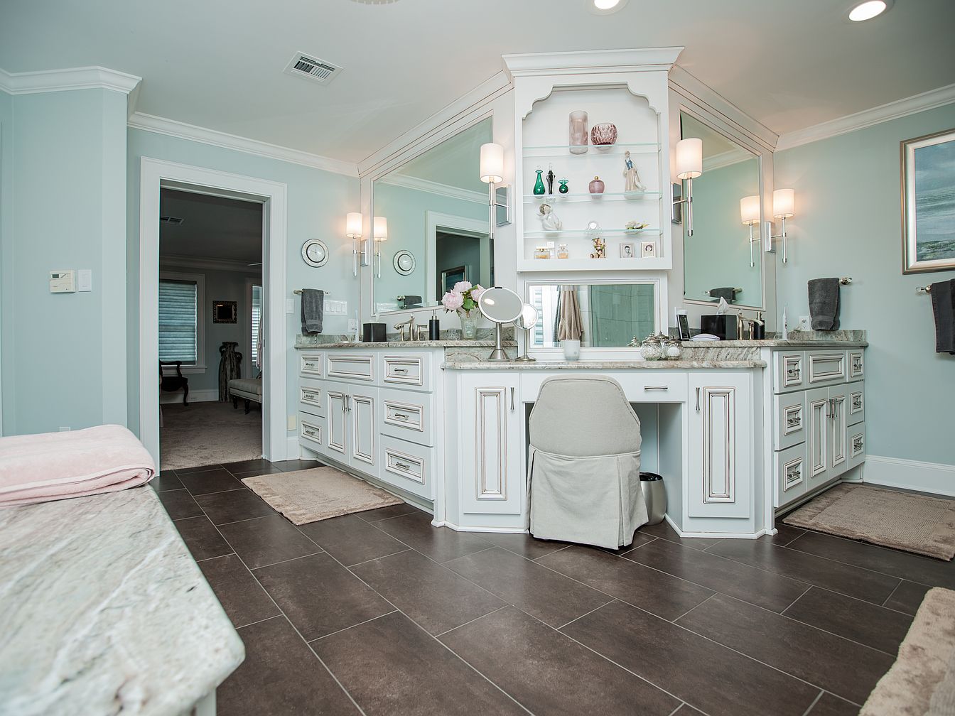 Spacious bathroom vanity area with elegant design, featuring dual sinks set in light granite countertops with abundant white cabinetry below for ample storage. Soft blue walls create a calming atmosphere, complemented by crisp white crown molding and large mirrors enhancing the sense of space. A cushioned, comfortable chair sits at a built-in makeup vanity, perfect for family routines or shared use. Warm lighting from wall sconces flanks the mirrors, providing excellent illumination. Decorative shelving above the vanity displays small collectibles and personal touches, contributing to a homey, inviting feel. Durable dark tile floors complete this inviting, family-friendly bathroom space.