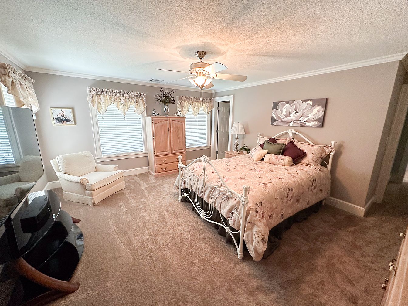 A spacious master bedroom features a soft, neutral color palette with beige carpet and light taupe walls. A large, comfortable bed with a floral patterned comforter takes center stage, accompanied by plush pillows in soft hues of green, burgundy, and gold. Two large windows with elegant, ruffled valances allow natural light to brighten the space, making it inviting for the whole family. An overstuffed cream armchair in one corner provides a cozy reading nook, while a sturdy, classic wooden armoire and matching nightstand offer ample storage. The room’s gentle lighting, ceiling fan, and floral artwork add warmth and sophistication, perfect for serene family living.