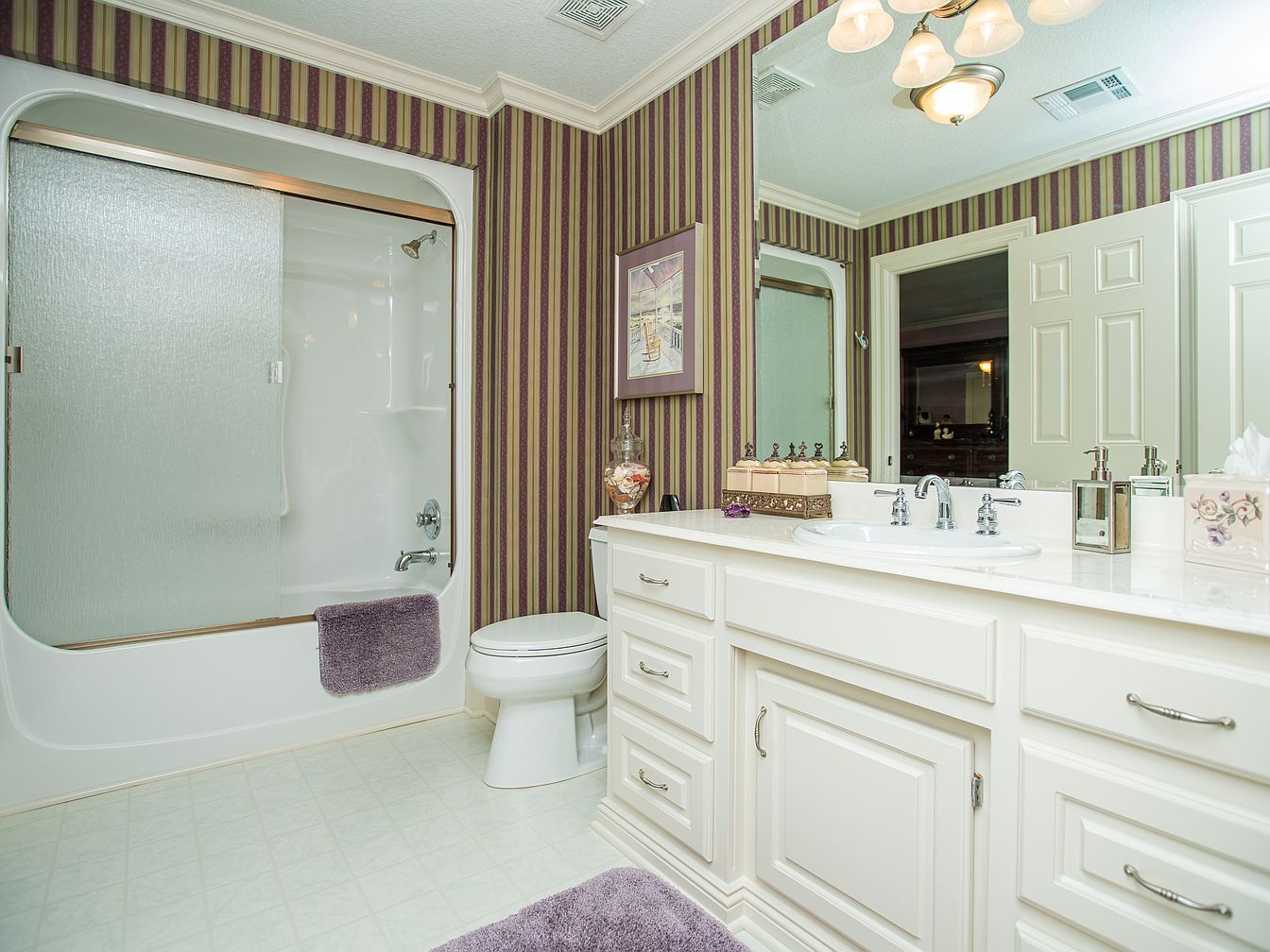 Spacious bathroom featuring a large white countertop with ample cabinetry, perfect for family storage needs. A double sink provides convenience for busy mornings. The elegant shower-tub combination includes secure sliding doors, ensuring practicality for children and adults alike. The room’s understated luxury is enhanced by striped wallpaper in shades of plum and gold, coordinating beautifully with plush lavender bath rugs for a comforting atmosphere. Overhead lighting casts a warm glow, while a large wall mirror enhances brightness and makes the room feel larger. Decorative touches, such as framed art and accessories, add a personal and inviting feel suitable for family living.