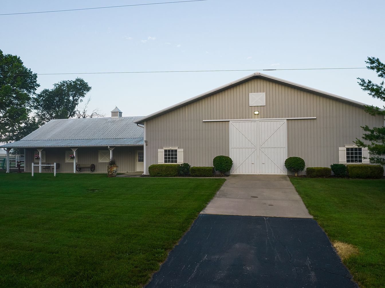 A spacious front yard with lush, neatly manicured green grass stretches toward a large barn-style structure with a wide, paved driveway. The farmhouse exterior is painted a soft beige-gray with crisp white trim, including double barn doors and window frames. The structure has a classic gable roof, corrugated metal roofing, and several windows that allow plenty of sunlight inside. Mature shrubs and landscaped bushes line the base, offering a welcoming and cared-for appearance. The covered porch area with hanging flower baskets and rustic farmhouse decor adds charm. The open lawn provides ample, safe space for children to play and families to gather outdoors.