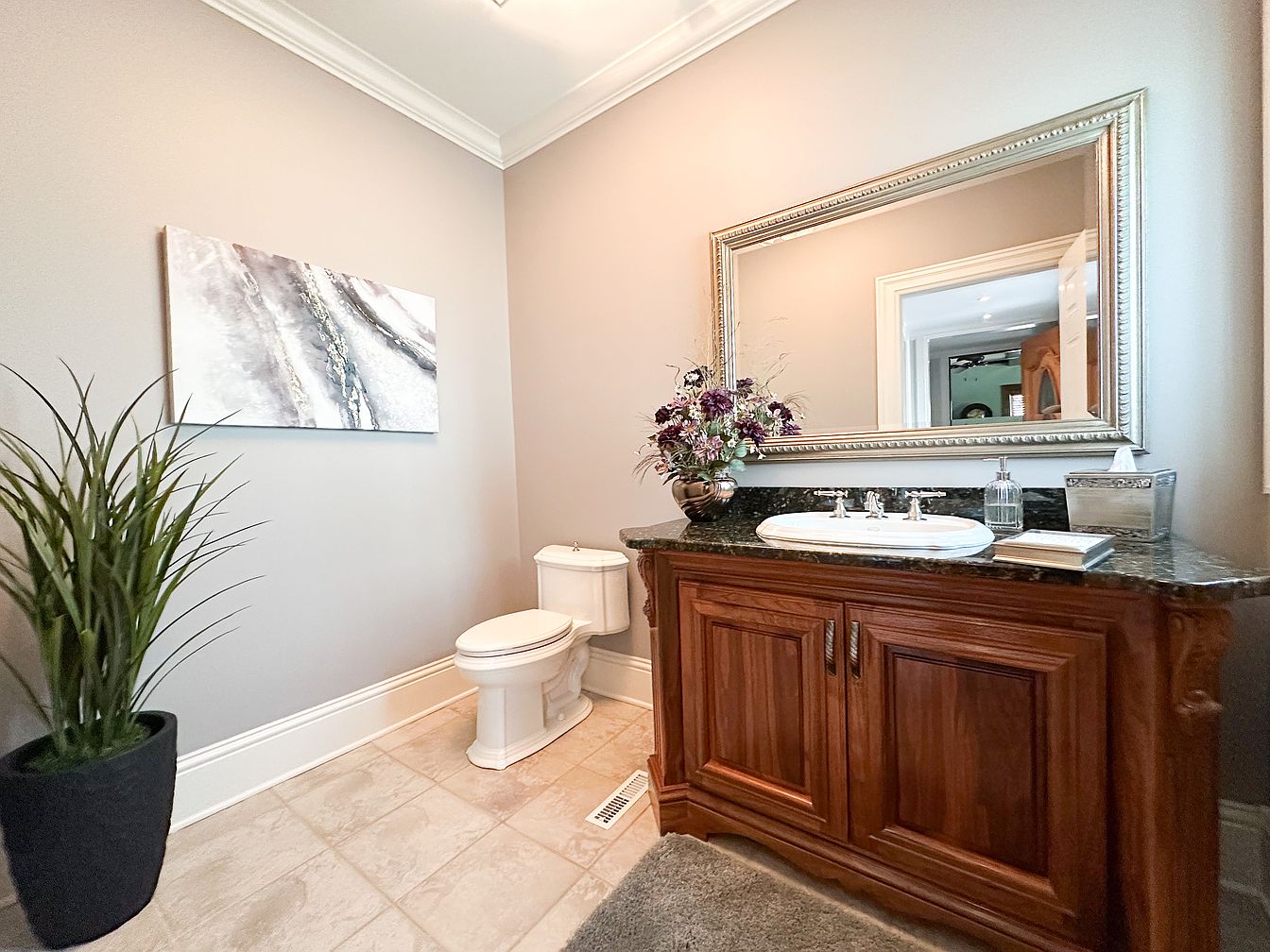 A spacious bathroom features a classic wooden vanity with rich, warm tones and an elegant dark stone countertop. Above the vanity hangs a large, ornate framed mirror that reflects light, making the room feel open and inviting. Soft gray walls offer a calming atmosphere, complemented by crown molding and beige floor tiles. A simple white toilet sits adjacent to an abstract piece of wall art, adding a touch of modern style. A plush gray rug provides comfort and warmth underfoot, while a vibrant green potted plant and a bouquet of purple flowers lend natural touches, creating a welcoming, family-friendly environment.