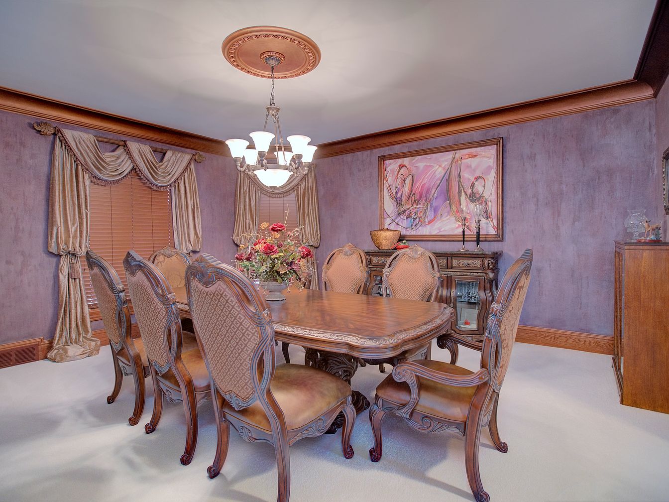 A spacious dining room with a large, ornate rectangular wooden table surrounded by eight matching carved wooden chairs featuring patterned upholstered seats and backs. The room is warmly lit by a classic chandelier suspended from a decorative ceiling medallion. Walls are painted in a muted lavender hue with elegant wood crown molding and baseboards. Gold-toned, gathered drapes frame two windows, adding a luxurious touch. A sideboard sits along one wall, topped with a floral centerpiece and family-friendly decorative items. This inviting space is perfect for hosting gatherings, with comfortable seating and an open layout that encourages togetherness and conversation.